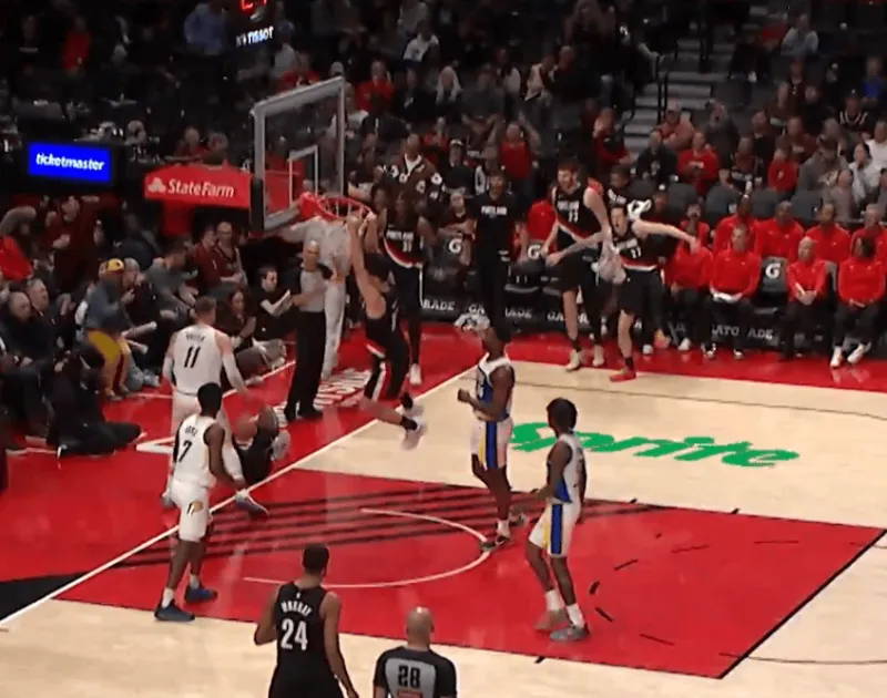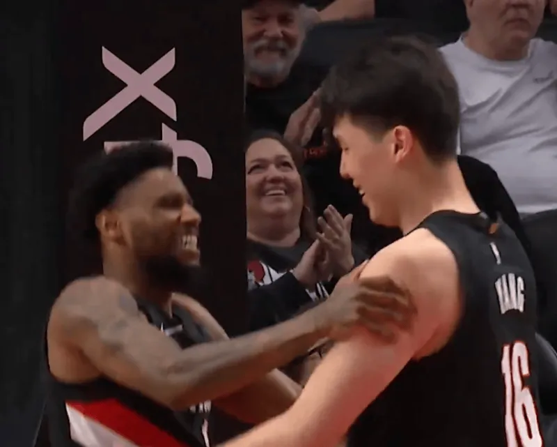 开拓者官方晒照:韦斯利脚踝终结晃倒对手,杨瀚森双手暴扣打成2+1,随后两人疯狂庆祝。