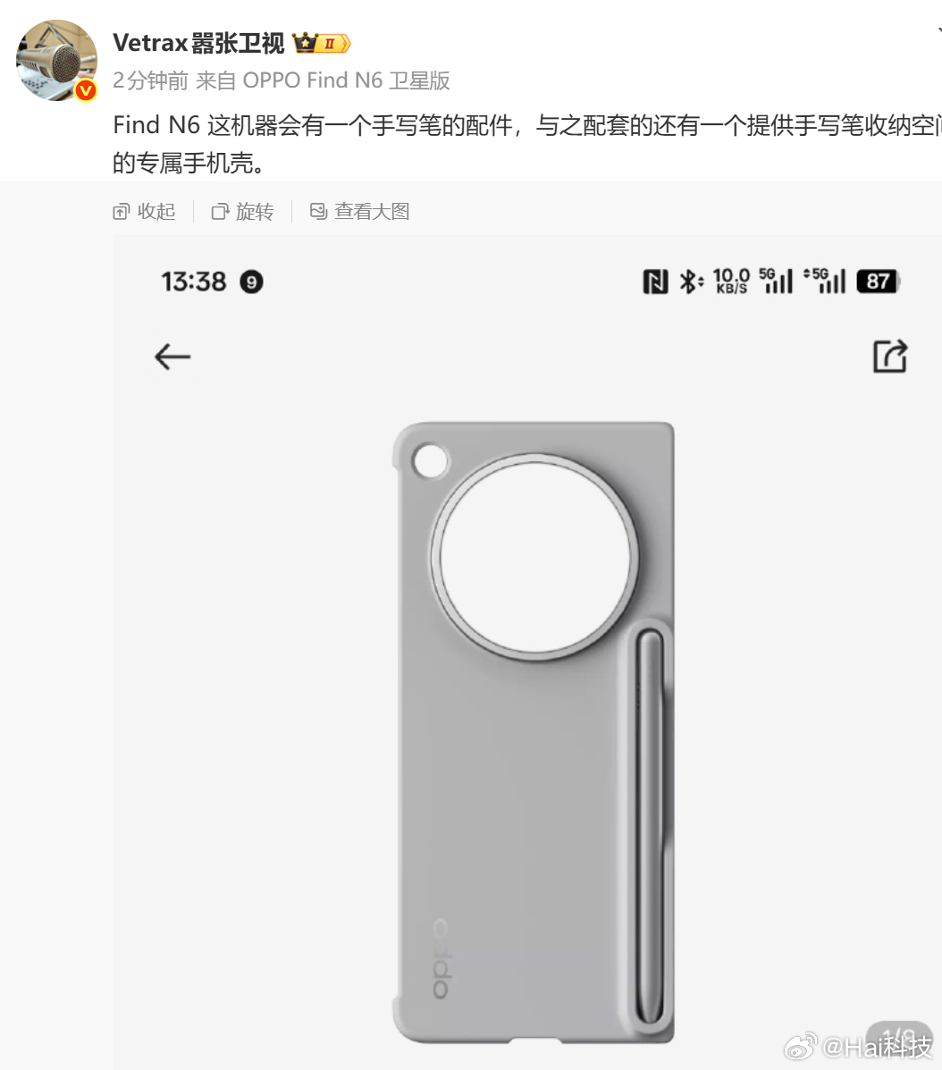 OPPO Find N6这个AI手写笔放在手机壳里,是这样放置形态。不出意外,应