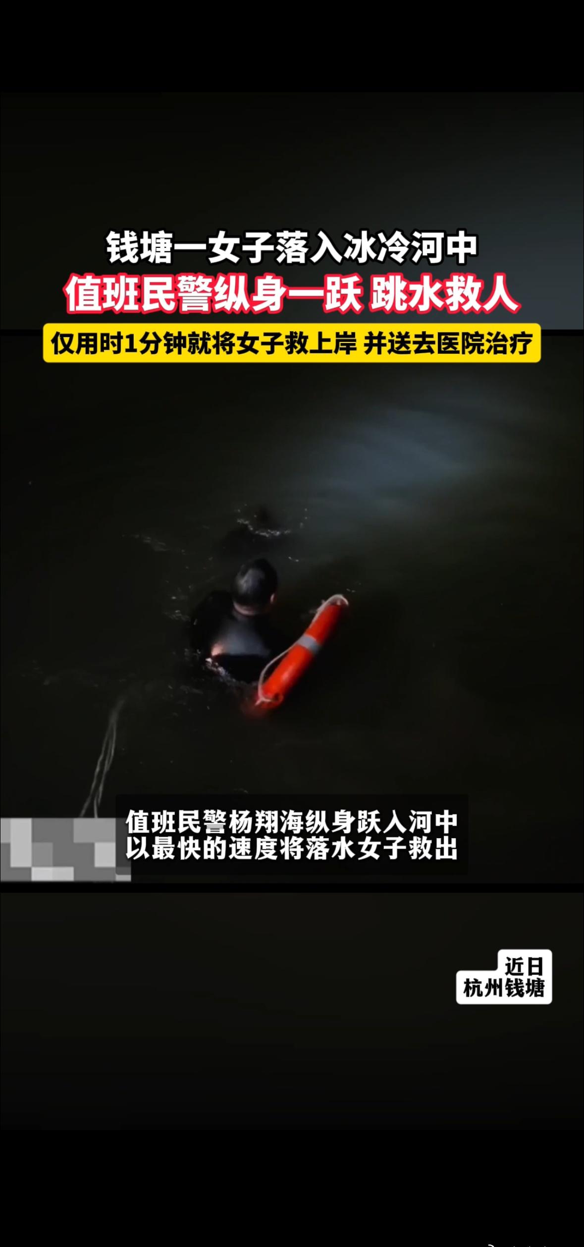“一分钟,能做什么?” 在杭州钱塘,这一分钟是与死神赛跑的生死时速。 日前,一名女子坠入冰冷河中。值班民警杨翔海赶到现场后,没有丝毫犹豫,纵身跃入水中!仅用时60秒,成功将女子托举上岸。因送医及时,目前女子已无大碍。