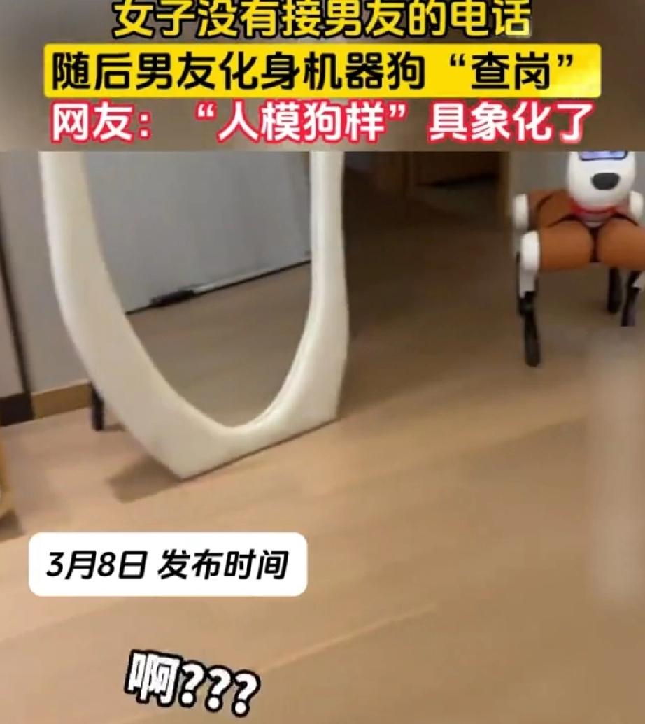 现代科技越来越深入我们的平常生活,就连谈恋爱也用上了高科技。 3月8日,男子给女友打电话。表示在女神节这个美好的日子,献上自己的祝福。可是对方就是不接电话。男子纳闷了,干嘛不接我的电话? 男子接通了在女友家的机器狗,远程遥控,看看女友在忙什么。机器狗设计挺有意思的,狗头上的屏幕,显示出遥控者的眼部,看上去是“人模狗样”的。 男子化身机器狗,查女友的岗。看到女友那一刻,男子乐了。原来女友是个电视剧发烧友,正在追剧,对男子来的电话浑然不知。 不得不赞叹,科学技术的发展太快了。人们用手机还没有多久,机器狗又走进了我们的生活。 女子没接电话 男友化身机器狗查岗女友 科技改变生活