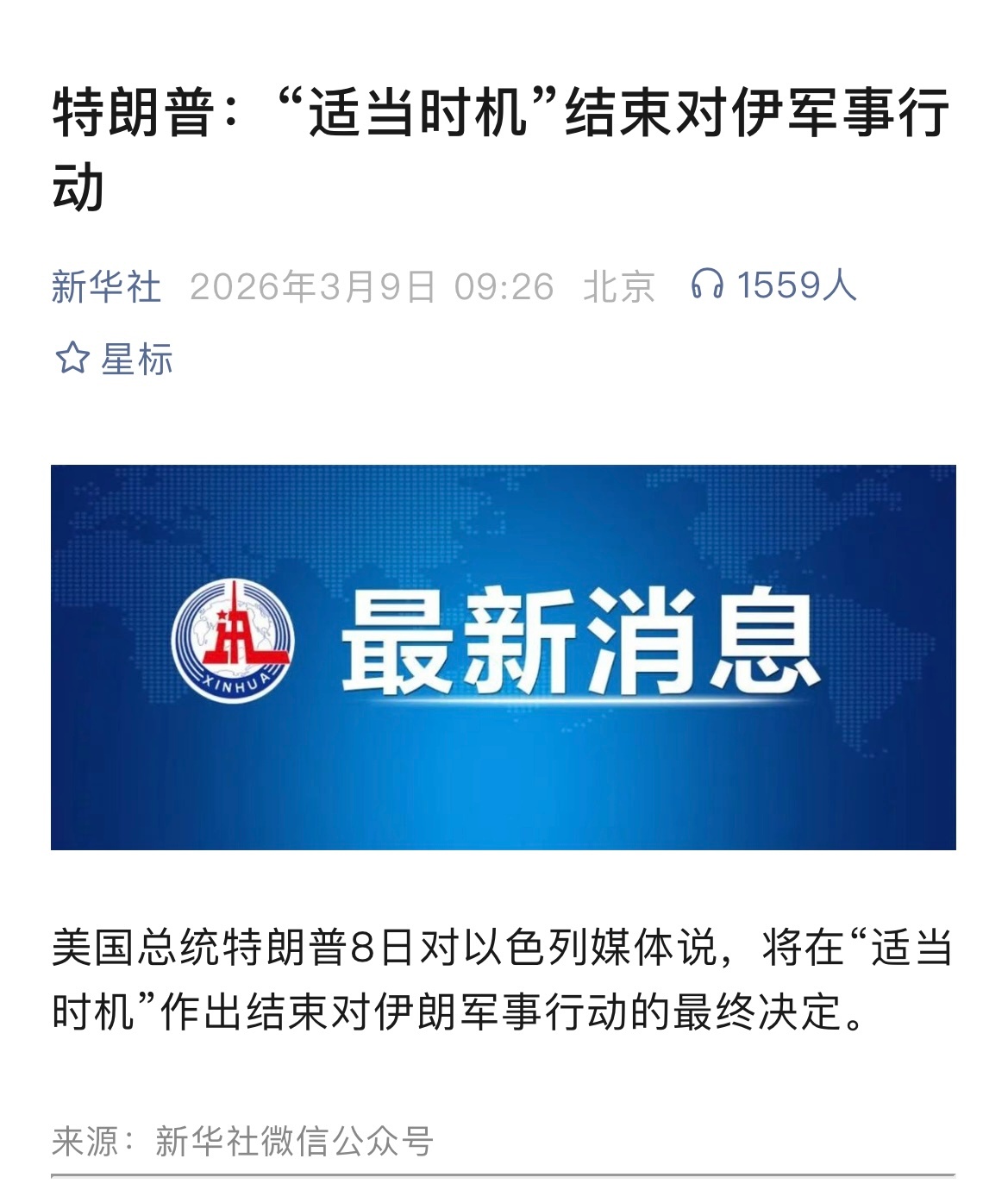 特朗普称适时结束对伊军事行动