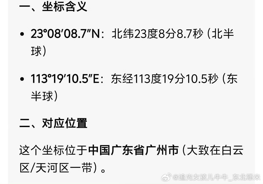 周深周深官宣2026巡回演唱会周深2026深深的巡回演唱会 周深发了194个啊 坐标含义2308'08.7"N:北纬23度8分8.7秒(北半球)11319'10.5"E:东经113度19分10.5秒(东半球)对应位置这个坐标位于中国广东省广州市(大致在白云区/天河区一带)真牛