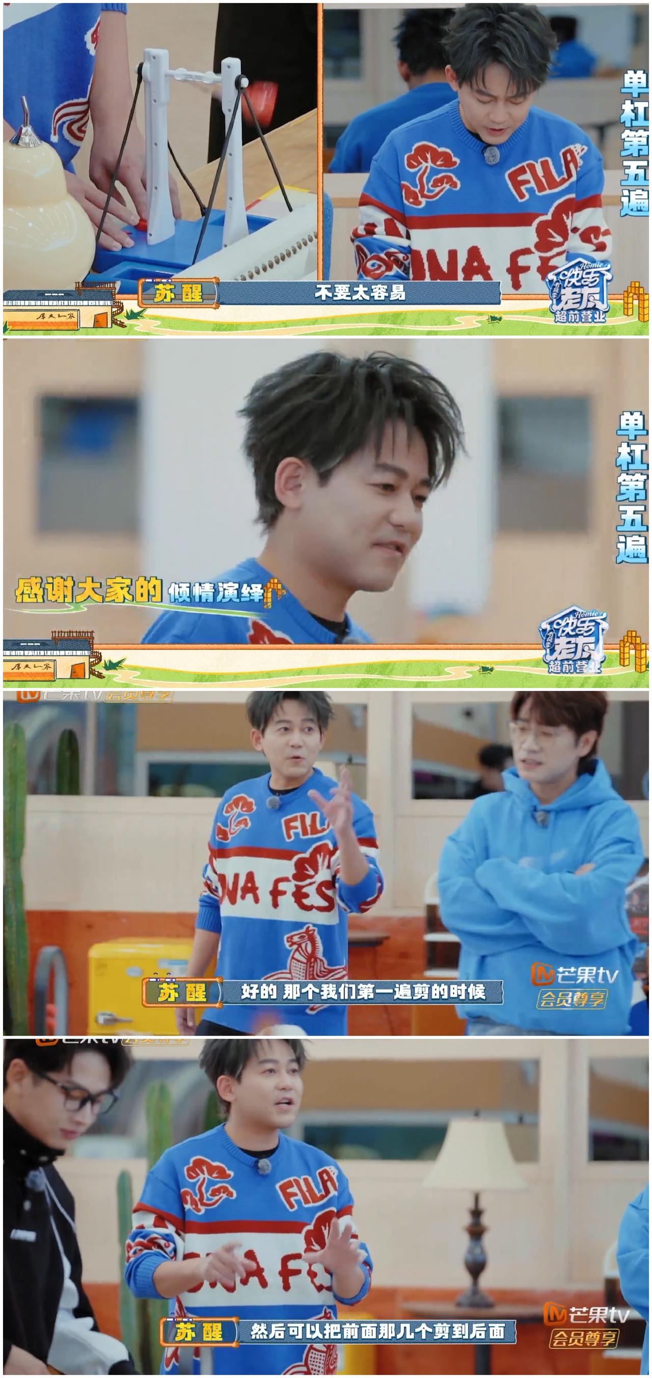 苏醒想要嘚瑟一下, 想不到遇到王铮亮, 完全暴露。 三位喜剧做客苏醒节目, 苏醒想要表演玩具单杆, 企图一次成功。 结果苏醒试了五次才成功。 于是为了挽尊, 他要求导演组只保留成功的那一遍, 把前面失败的四遍剪掉。 而在王铮亮的指导下, 齐思钧一下子就成功了, 由此可见这个桌上单杆, 最厉害的是王铮亮。 哎呀, 苏醒在前面一顿嘚瑟, 结果众人发现“王者”是王铮亮。 苏醒那么爱演, 李逗逗就陪着他演, 陪他装, 假装不知道王铮亮厉害, 一个劲夸苏醒, 情绪价值给得满满的。 看不得苏醒伤心与没有面子。 苏醒太有节目效果了, 明明不擅长就在那里“装”, 非得王铮亮出手揭穿他。