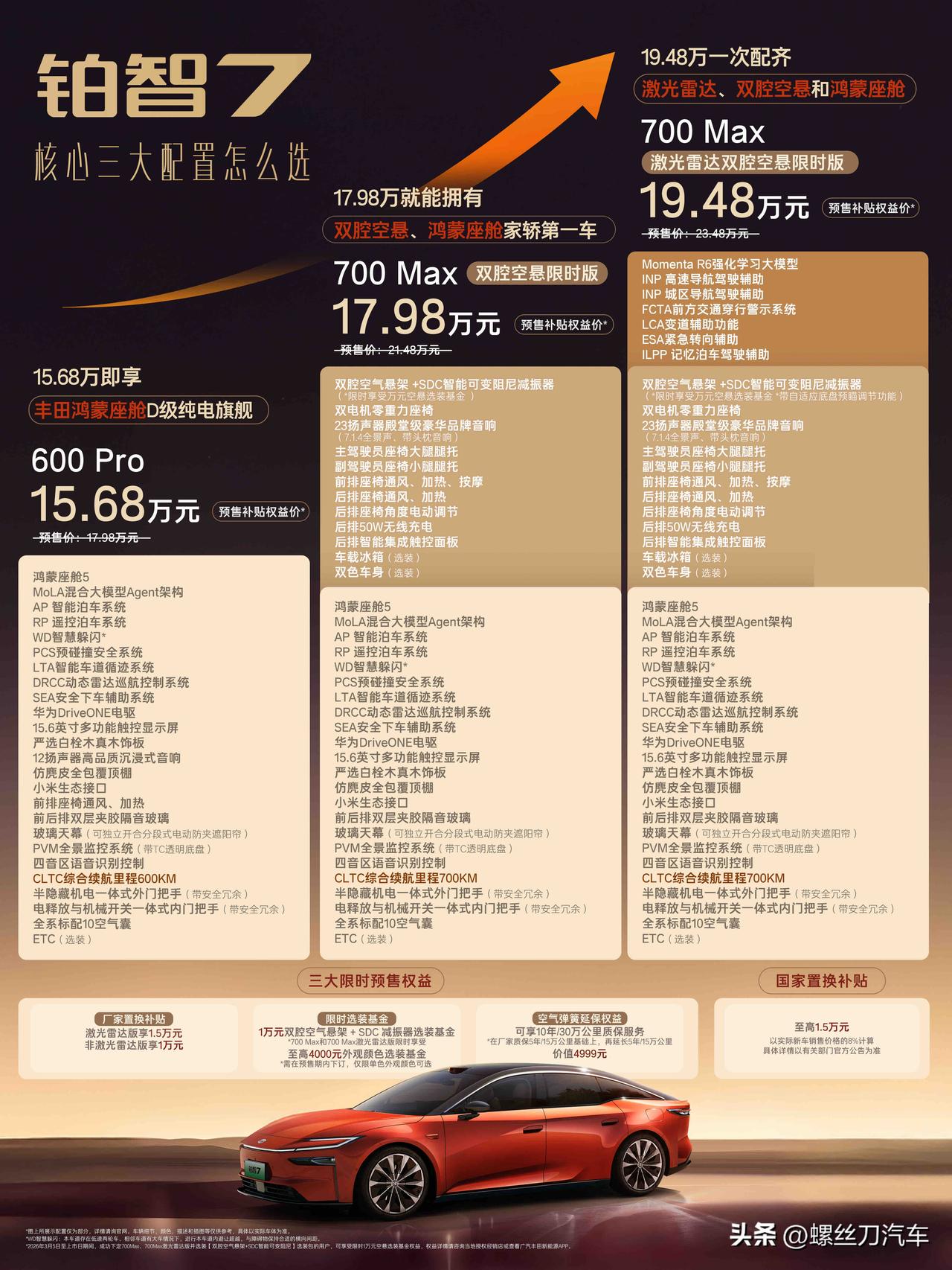 铂智3X大获成功后,广汽丰田火速带来第二款中国化纯电新车铂智7,依托于丰田百年造车积淀,整合华为鸿蒙座舱、Momenta驾辅和小米生态,更是在预售发布会上喊出15.68-20.98万元的预售补贴权益,含双腔空悬、激光雷达、零重力座椅、全景HUD抬显的顶配版本也仅需20.98万元,远低于行业平均水准,这配置以前可是30万级才能给到的!!! 目前实车已到店可到店体验,首批下订用户月底即可提车,新车预售补贴权益价15.68万元起。并且预售推出限时三大权益(至高1.5万置换补贴、至高1.4万选装基金、价值4999元空簧延保),叠加后空气弹簧可享10年/30万公里超长质保,还有三电终身质保与厂家“三担责”保障,电车自燃厂家担、电池衰减厂家担、智能泊车事故厂家担,全周期打消用户用车顾虑。 可以说,铂智7打破高端配置价格壁垒,入门版即标配鸿蒙座舱5;17.98万即配双腔空悬悬架+SDC智能可变阻尼减震器;19.48万元即可买齐双腔空悬、激光雷达高阶智驾等旗舰配置。 整体而言,铂智7现在给出的15.68万元价格还只是预售补贴价,等到3月底正式上市估计还有调价空间,即便是最低配价格不变,中高配需要选装的空悬套装也可能变为赠送,这样性价比也能进一步提升。大家一起来感受下,不得不说丰田也开始堆料了,铂智7太强了!