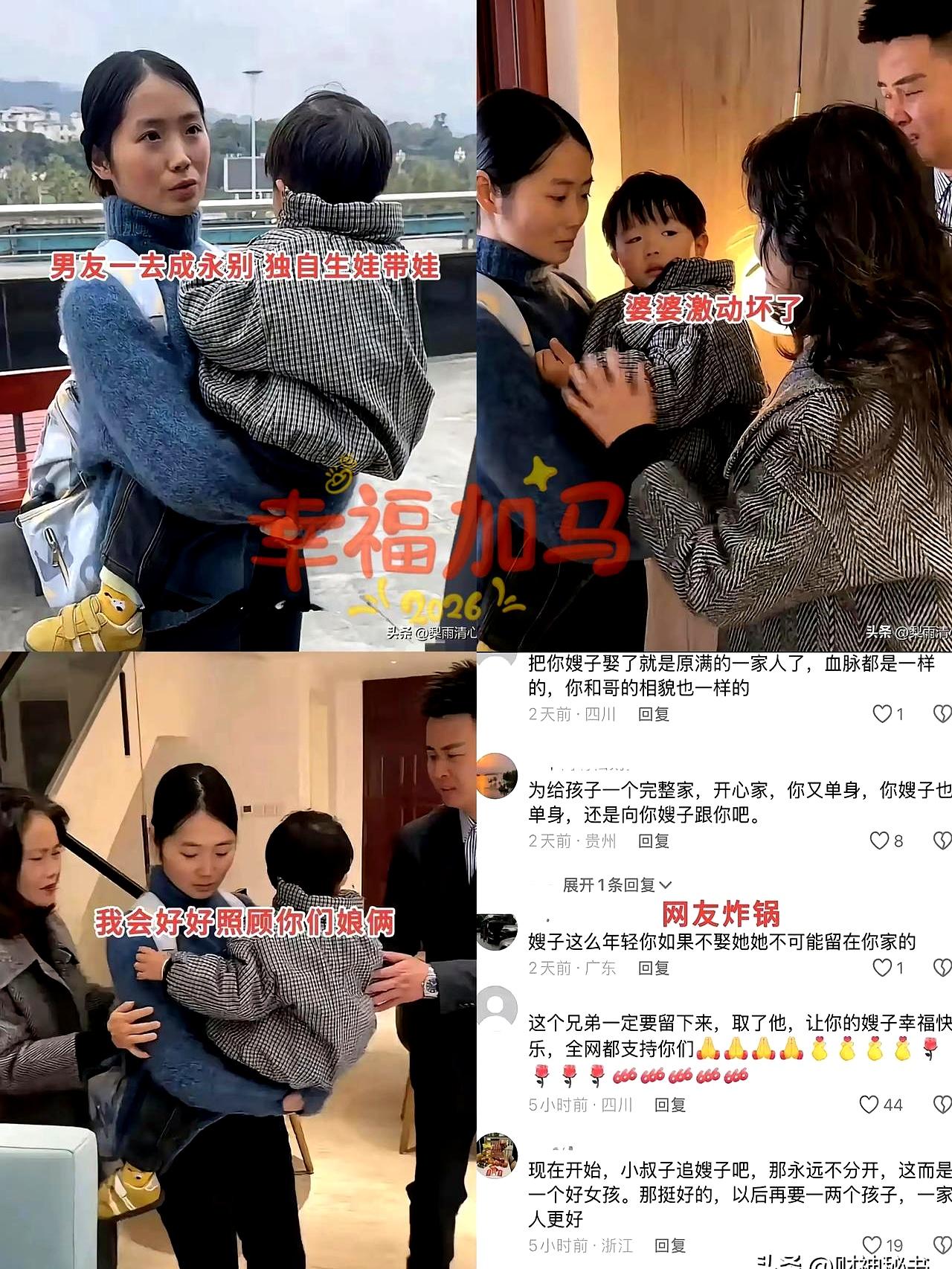 你说这姑娘得多死心眼儿啊,一见钟情谈了个对象,失联五年愣是没放弃找他。 自己怀孕生孩子,一个人把孩子拉扯到五岁,好不容易打听出他老家地址,带着娃就赶过去了。 结果呢? 到了地方才知道,那男的早就没了,站在眼前的,是他那个双胞胎弟弟! 这消息简直晴天霹雳,谁能想到苦苦找了这么多年,最后等来的是这种结局? 好在男方家里人没把她和孩子往外推。 老太太抱着孙子眼泪直掉,小叔子也挺实在,跟她说“以后这儿就是你家”。 网友们倒是操心得很,嚷嚷着“嫂子这么漂亮,小叔子干脆娶了呗,孩子就当亲生的,一家人整整齐齐多好”。 说白了,外人再怎么出主意也就是个热闹,关键还得看他们俩自己相处有没有那份意思。 要是真能处出感情来,那确实算是给这桩心酸事画了个圆满句号。 你说这事儿要是拍成电视剧,结局会不会真按网友想的来?