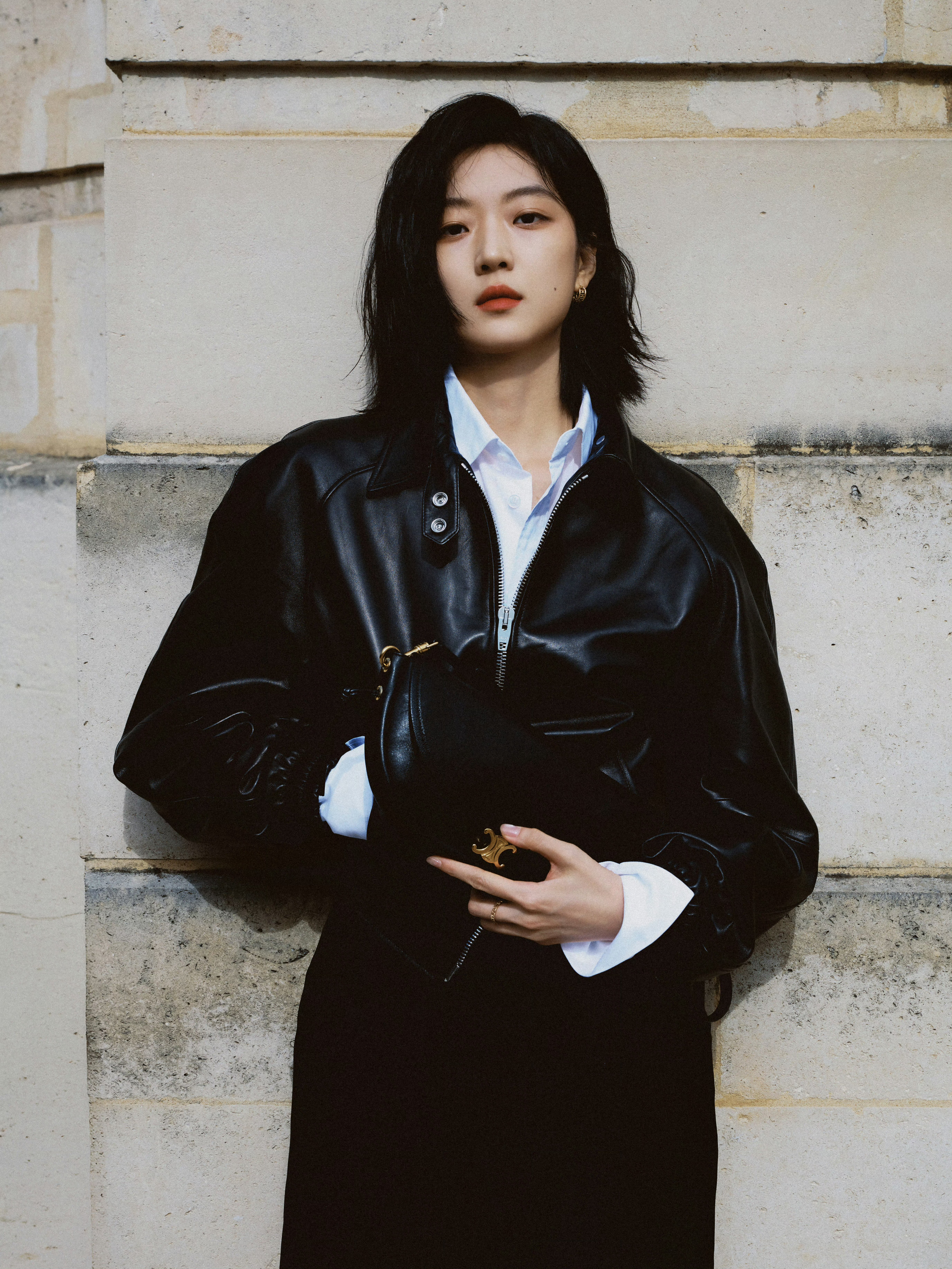 头排嘉宾中,品牌大使王安宇的黑色廓形西装内搭撞色POLO衫,示范了何为“法式复古与少年清冷的融合”;品牌大使孙千以全黑皮革造型亮相,展现出“有锋芒的人”的另一面,东西方美学的碰撞恰好构成CELINE当下的多元面貌。