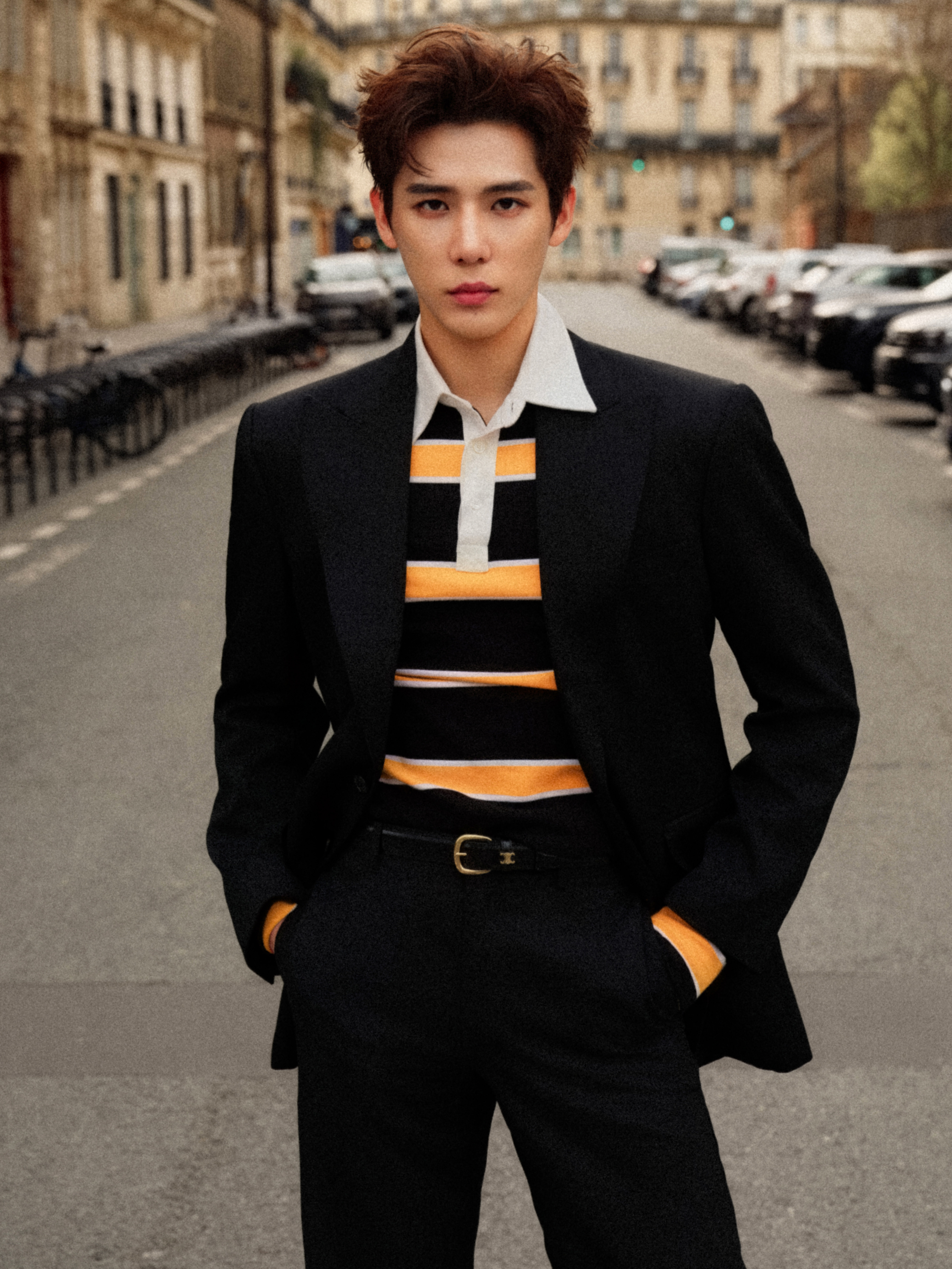 设计语言的核心是“恰到好处的出格”。沙色、驼色奠定沉稳基底,海军蓝与红色的条纹领带成为点睛之笔;粗犷牛仔夹克搭配优雅长裤,学院风Polo衫作为西装内衬——美式休闲与法式优雅在此碰撞。玳瑁眼镜延续知识分子风,最引人注目的是胸前的枪套式皮质文件袋,兼具功能与反叛,完美诠释信中所述“一场微小的反叛”。