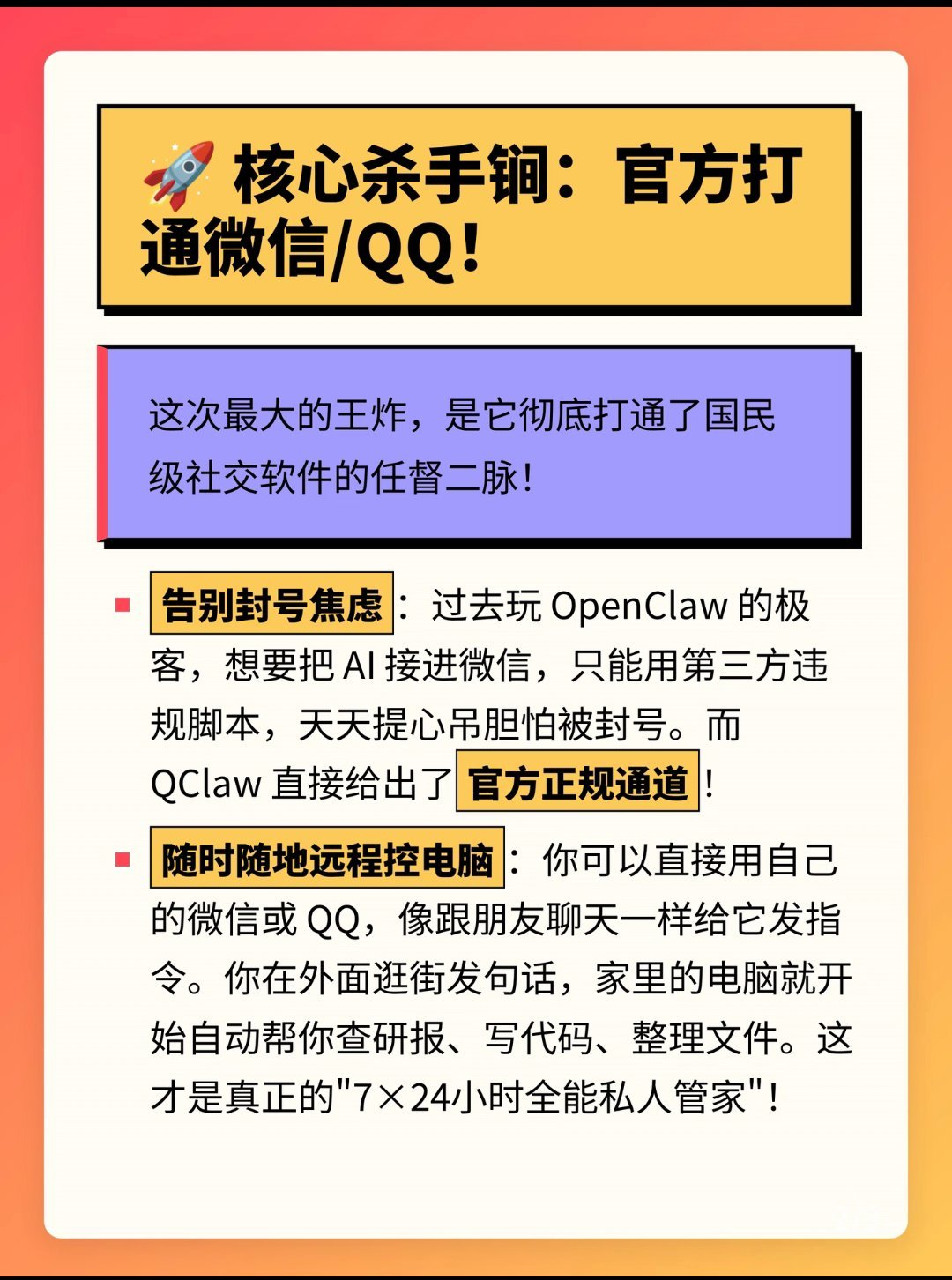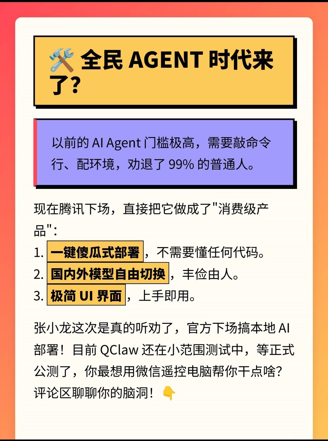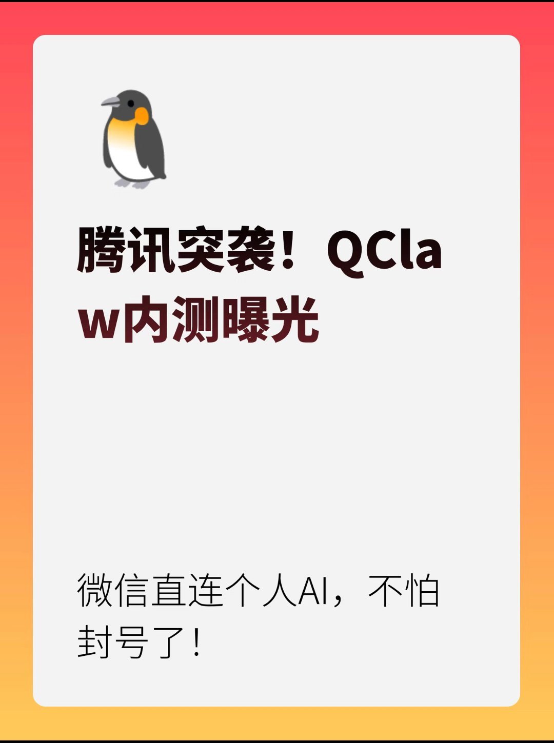 腾讯QClaw内测🐧极客圈大瓜!腾讯正在悄悄内测一款名为“QClaw”的重磅级AI产品!它是基于最近大火的OpenClaw重新包装的“消费级Agent”,告别命令行,小白一键部署超简单!张小龙这次终于听劝了!官方下场做本地Agent,这波降维打击你觉得香吗?等公测了你想用它干嘛?评论区聊聊脑洞!👇