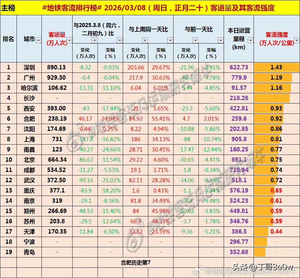 三八节长沙地铁客流量超238万人次,不如郑州地铁。[呲牙][呲牙][呲牙] 爆料 身边事 三八节 排行榜 长沙 郑州 周日 3月8日(星期日,三八节) 全国地铁客流量城市排行榜: 广州929.30万 广州地铁 深圳890.13万 上海731.0万 北京663.34万 成都534.52万 成都地铁 西安393.0万西安身边事 重庆377.10万 武汉372.50万武汉爆料 南京319.0万 郑州266.69万郑州地铁 长沙238万+长沙地铁 合肥238.19万 苏州203.80万苏州爆料 沈阳174.69万沈阳身边事 天津170.35万天津地铁 青岛123万+ 南昌123.0万南昌爆料 宁波106万+宁波身边事 哈尔滨106.62万