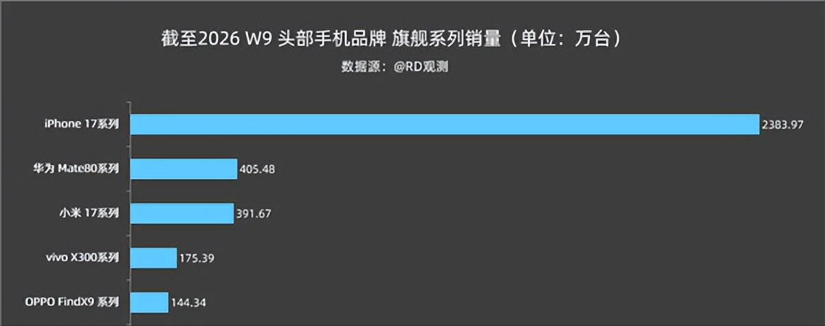 谁能想到,2026 旗舰市场竟上演一边倒战局!最新第三方数据曝光,榜首销量直接甩开第二名数倍,国产双雄贴身肉搏,差距大到惊人。[震惊] 答案揭晓:苹果 iPhone 17 系列以2383.97 万台断崖式登顶,一家销量远超后续所有旗舰总和。华为 Mate 80 以 405.48 万台守住国产第一,小米 17 系列 391.67 万台紧追不舍,两家缠斗激烈。vivo X300、OPPO Find X9、荣耀 Magic 8 依次入榜,销量均在百万级。 高端市场格局已定,苹果独大,国产阵营奋力追赶。