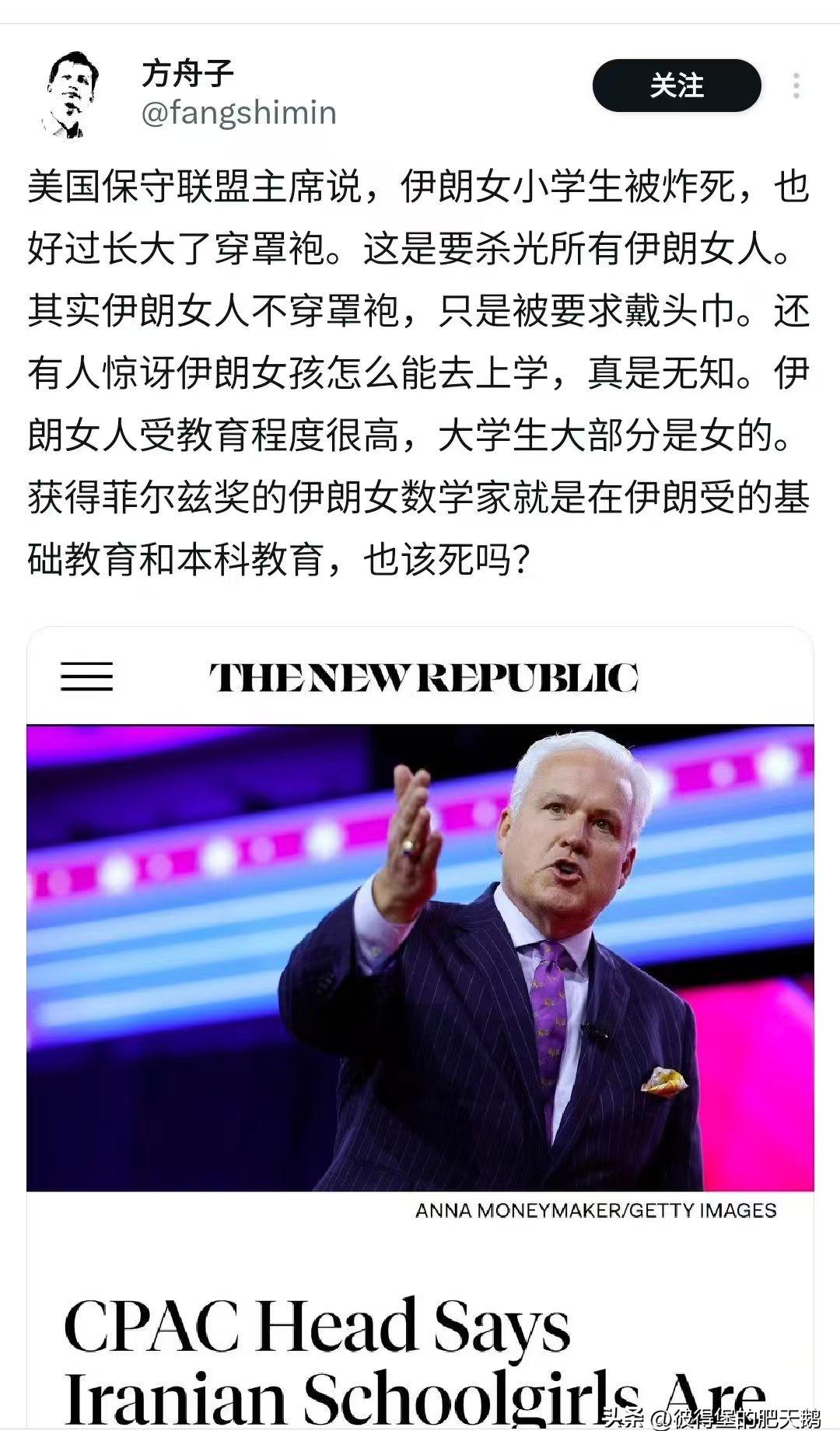 美以对伊朗发动的侵略战争,炸死女子学校165人的暴行连方舟子都看不下去! 正如方舟子说的,伊朗女性受教育程度很高,伊朗女性就该死吗? 打着“民主自由”的旗号就可以肆意践踏和侵略一个主权国家,这事儿居然发生在2026年! 美帝国主义的丑恶嘴脸百年未变。只是因为我们的祖国变强大了,它们才不敢肆意侵略我们,才不得不跟我打嘴仗,坐下来谈判,因为它们不听话的话,咱们真的会些拳脚。 #美伊以冲突# #海外新鲜事# #热点观点#