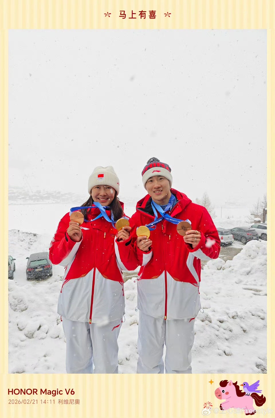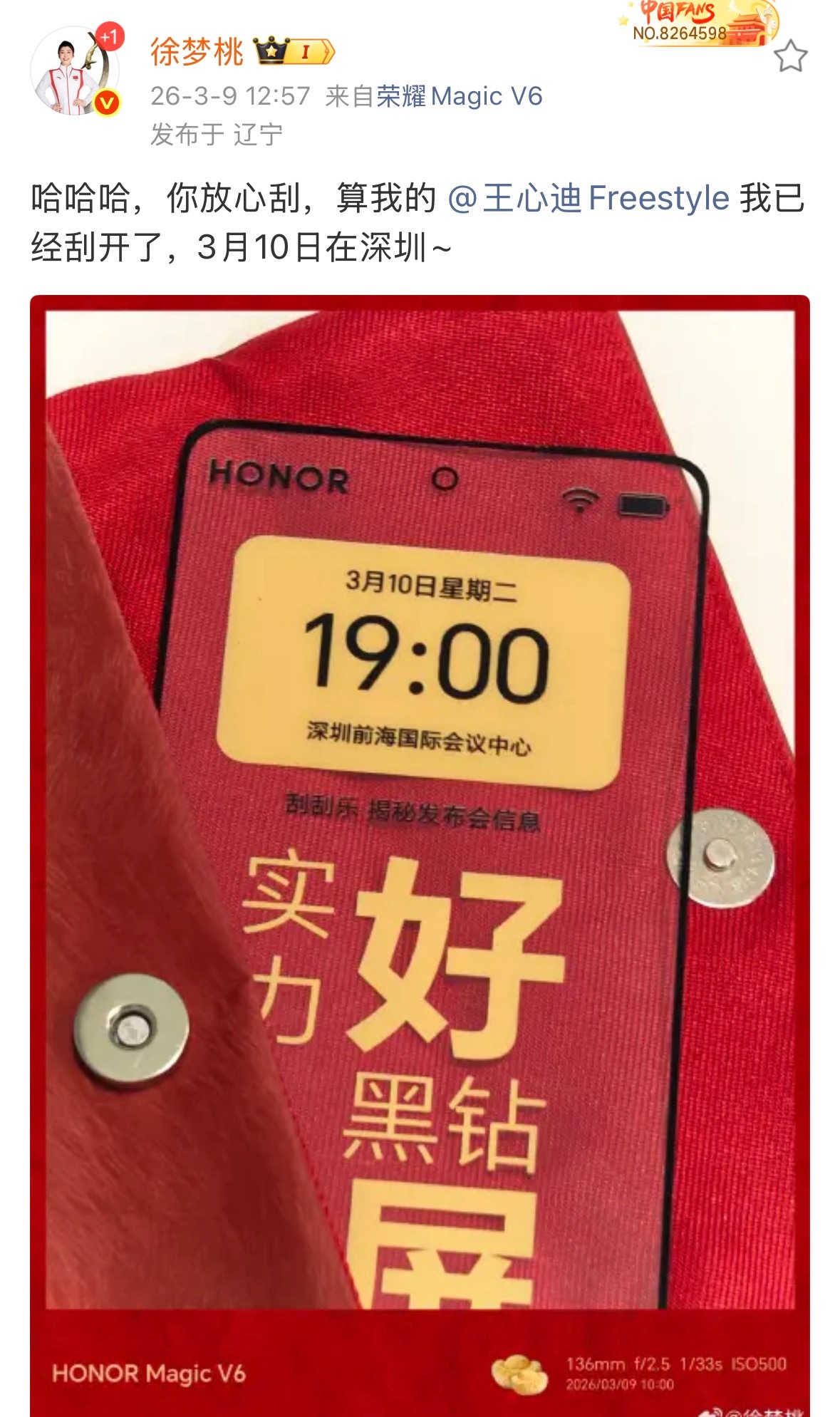 荣耀这波操作可以的,冬奥先拿赤兔红刷脸,巴展再让国王带货,现在回国直接请奥运冠军夫妇站台。荣耀Magic V6排面拉满,是不是真和官方说的那么猛,明天晚上见真章吧。徐梦桃王心迪将亮相荣耀发布会