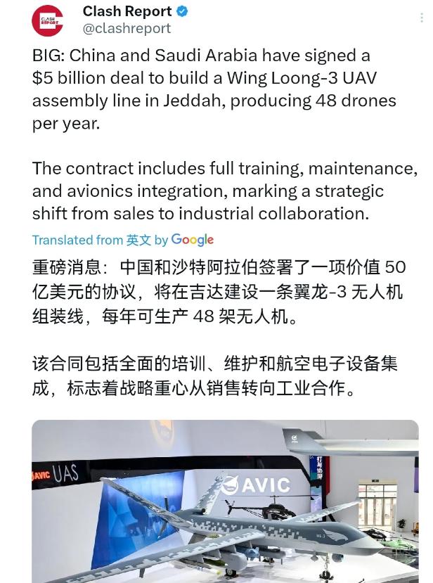 [微风]沙特被打醒了!沙特紧急与中国敲定了军工订单!3月7日,根据外媒报道,外媒称,中国和沙特阿拉伯签署了一项价值50亿美元的协议,该协议的核心是中国将在吉达建造一条翼龙-3无人机装配线,每年生产48架无人机。该合同包括完整的培训、维护和航空电子设备集成等等。 沙特的这次选择,并非心血来潮,也不是偶然。从表面上看,中东地区现在局势动荡,沙特面对越来越频繁的无人机袭击和饱和打击,防线不断被突破。 但追根溯源,沙特真正的危机源自它自己对依赖体系的反思。过去的几十年,沙特的国防和安全几乎完全依赖美国。 作为超级石油出口国,沙特毫不吝啬地为安全买单,千亿美元的武器订单接二连三地签,从F-15战斗机到美制爱国者防空系统,再到精密的MQ-9死神无人机,沙特依赖美国保护的信念根深蒂固。然而,现实却一次次打脸。 在沙特的认知里,价格昂贵的爱国者防空系统应该是坚不可摧的“护城墙”,可事实上,在面对成本只有几千美元、速度低空飞行的无人机时,这套系统竟然毫无作为。 石油设施和大使馆在接连的攻击中付之一炬,经济命脉和政府权威岌岌可危。令人愤怒的是,美国“强有力”的保护竟然只停留在口头。 不仅在战场危机中执行不了有效的防御部署,还不断滥用武器输出的技术性限制,甚至一再拖延装备交付时间。 更可笑的还是,即便以每台上亿美元的价格引进的高级无人机,像MQ-9死神这样的利器,却在维修权限、技术支持甚至基础操作上都把沙特人拒之门外。 有了“主人”,才能启动这些昂贵的机械,这种被束缚的安全感使沙特开始深刻质疑:在国际权力体系里,它究竟是客户还是棋子? 不只是沙特政府的军事采购政策遭到了质疑,更深层的问题在于盟友关系的失衡。近年来,美国与沙特的关系一方面因能源合的松绑陷入裂痕,另一方面因中东局势的不可控愈发充满矛盾。 尤其是,当沙特的炼油厂遭受到无人机袭击的残酷打击时,美国的反应冷漠,甚至将注意力优先聚焦在自己的驻军基地上。 沙特开始意识到,所谓的盟友关系不过像是个虚假的保护壳。沙特背后的“保护伞”随时可能变成无用的装饰品,甚至在战略对峙时成为真正的累赘。 这一次,沙特不想再任人摆布。它迫切需要找到能真正满足其核心需求的合作伙伴。显然,中国的军工技术、合作模式以及更坦率、透明的国际姿态成为沙特新选择的最佳选项。 和美国不同,中国在军工合作上从未简单地“售卖产品”,而是通过技术分享和本地化培养,帮助合作伙伴真正具备“造血能力”。 翼龙-3无人机及其生产线的移交,是对沙特长期困局的一次重要解脱。更加令人瞩目的是,这项合作并不单纯依赖经济利益,而是帮助沙特实实在在抓住“工业自主”和“国防本土化”这一发展脉搏,翼龙-3无人机的技术参数足以让沙特在中东区域重新定义自己的军事话语权。 这款携带能力达到2.3吨、续航超过40小时的先进无人机在实战中的表现早有口碑,是可在多个战场模式下灵活切换的武器系统。 相比之下,美国同类型的MQ-9不仅价格昂贵,而且在多用途弹药挂载、飞行续航能力上不及翼龙-3一半的利用效率。 更重要的是,中国在对沙特开放技术转让时,无条件地消除了技术壁垒,避免了附带任何政治框架的“绑定条件”。 这给了沙特极大的战略自主权,不仅成为沙特国防的硬实力补充,还解除了过去在美方体系下那种有“武器无核心”的无奈局面。 值得深思的是,沙特和中国这一合作背后,还折射出更广的中东战略态势演化。过去几十年,中东一直是美国操控的大棋盘,而沙特则被牢牢束缚在这局棋子之中。 然而,近些年来,随着中东本地区形势复杂性的增加,各国的自主诉求愈发强烈。无论是沙特的《2030愿景》还是其他中东国家对工业化的追求,本质上都在传达一个态度:中东已经不满足于那些依赖输血的政策安排,而是要以更独立的姿态发声。 中国在这一过程中所扮演的角色,让全球看到了一个新的可能:中东国家可以不受传统合作模式的限制,旨在寻求符合其实际发展道路、更全面的合作机制。 总而言之,此次迎来了翼龙-3无人机生产线的沙特,意义已然超出军购范畴。对沙特来说,这是一次开始打破枷锁的尝试,更是一次由依附到独立的转型。 而这条生产线发出的轰鸣声,远不止于生产无人机,它带来的更多是关于产业升级的启示,关于区域战略的重塑,关于全球合作领域的另一种可能。 中东的天空也许不会再只是单极秩序的专属领域,沙特与中国的合作已经开启了破局的第一步。在乱局动荡的今天,掌控自己的话语权,才是守住长久安全的唯一解答。而沙特选择中国,则为这种解答提供了雪中送炭的助力。