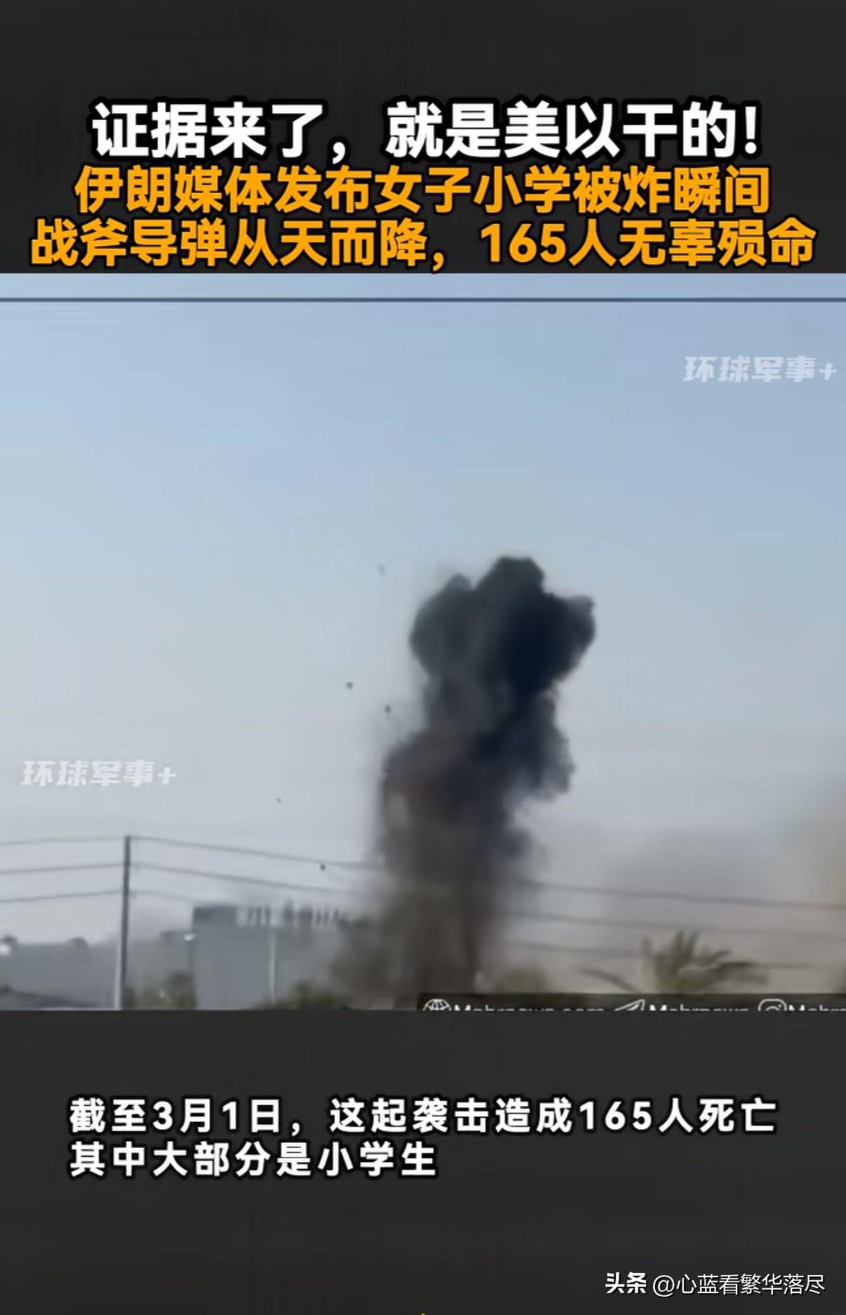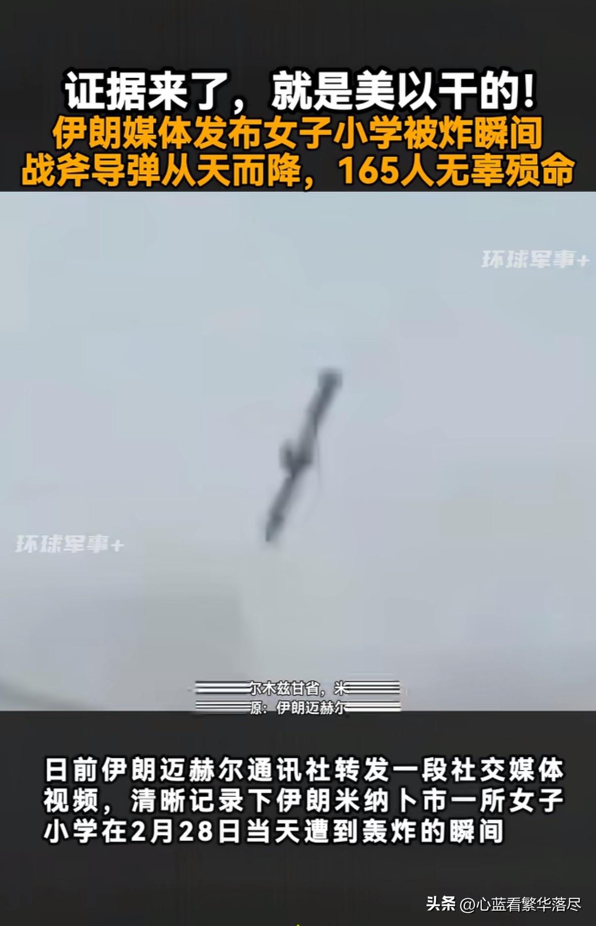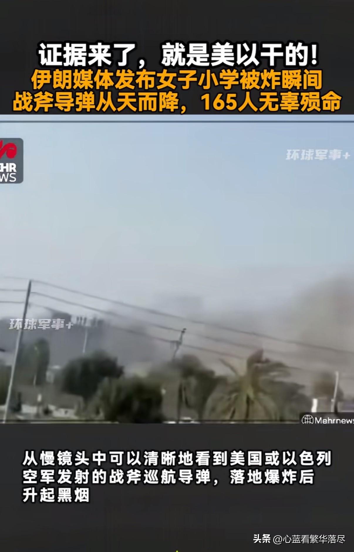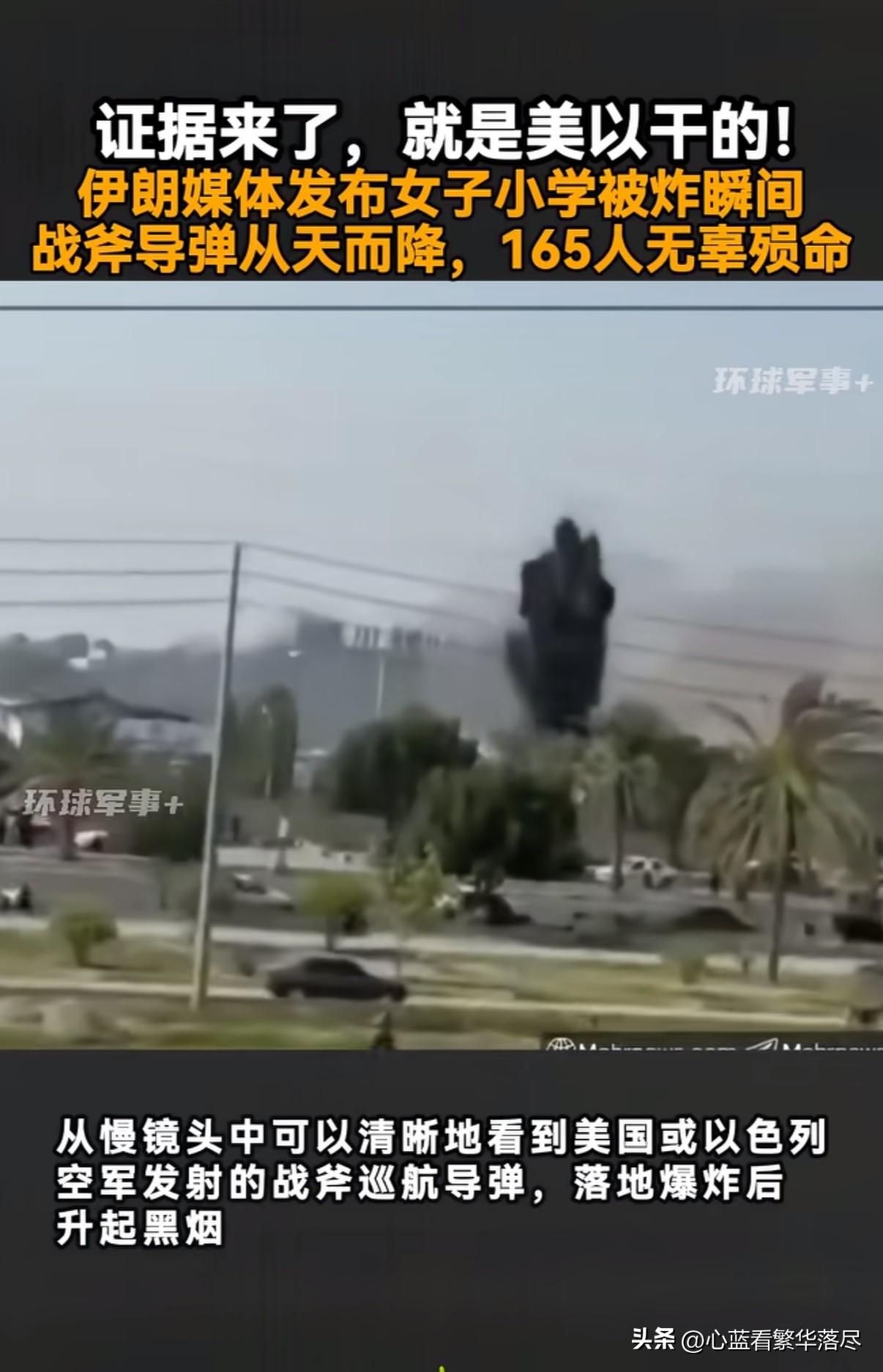 证据来了,就是美国和以色列干的!近日伊朗媒体发布了一段视频,清晰的记录下2月28日伊朗米纳卜市一所女子小学遭到轰炸的瞬间,从慢镜头中可以清晰的看到美国或以色列空军发射的一枚战斧巡航导弹,在伊朗女子小学落地爆炸后升起黑烟,这起袭击造成至少165人遇难,其中大部分都是小学生! 更让人无语的是,美国总统特朗普在3月7日竟然宣称袭击伊朗小学,是伊朗人自己干的,并称伊朗的弹药袭击非常的不准确,毫无精准度可言。目前伊朗公布出来的这一段视频,可以清晰的看到是一枚战斧巡航导弹精准的袭击了伊朗小学,面对这铁证如山的证据,不知道特朗普又该如何抵赖呢?