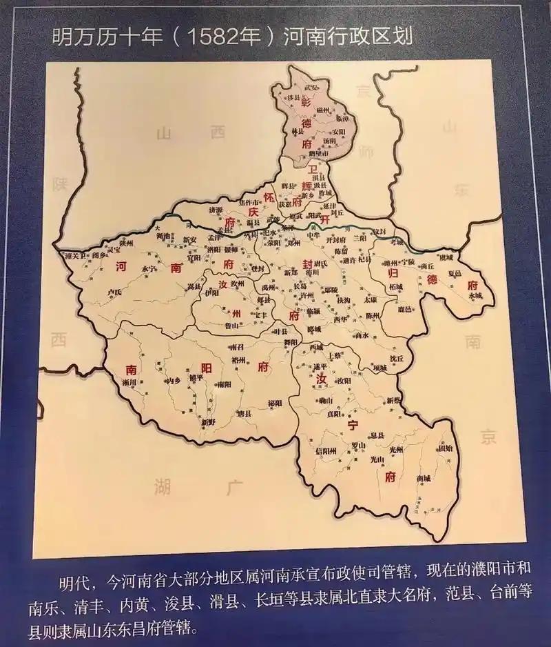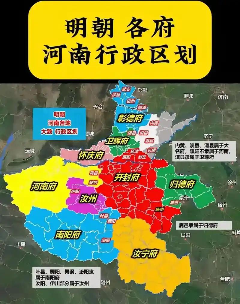 明朝时河南九府的治所所在地和所辖县州数量。 1:开封府,治所开封市。下辖34个州县。 2:归德府,治所商丘市,下辖10县。 3:卫辉府,治所汲县,下辖6县。 4:怀庆府,治所河内,下辖6县。 5:河南府,治所洛阳市,下辖14县。 6:汝州直隶州,治所汝州市,下辖5县。 7:南阳府:治所南阳市,下辖11县。 8:汝宁府,治所汝阳县,下辖14县。 9:彰德府,治所安阳市,下辖7县。 另外,现今河南的一些县当时归属直隶和山东。 1:河北大名府,治所在大名县,辖如今河南5县。 2:山东东昌府,治所在濮州,辖当今河南2县。 3:山东兖州府,辖当今河南1县。 图片选自网络,有侵必删。