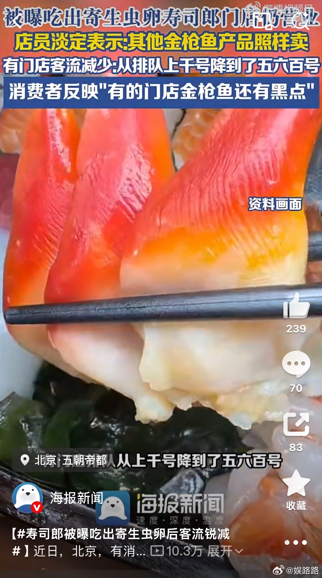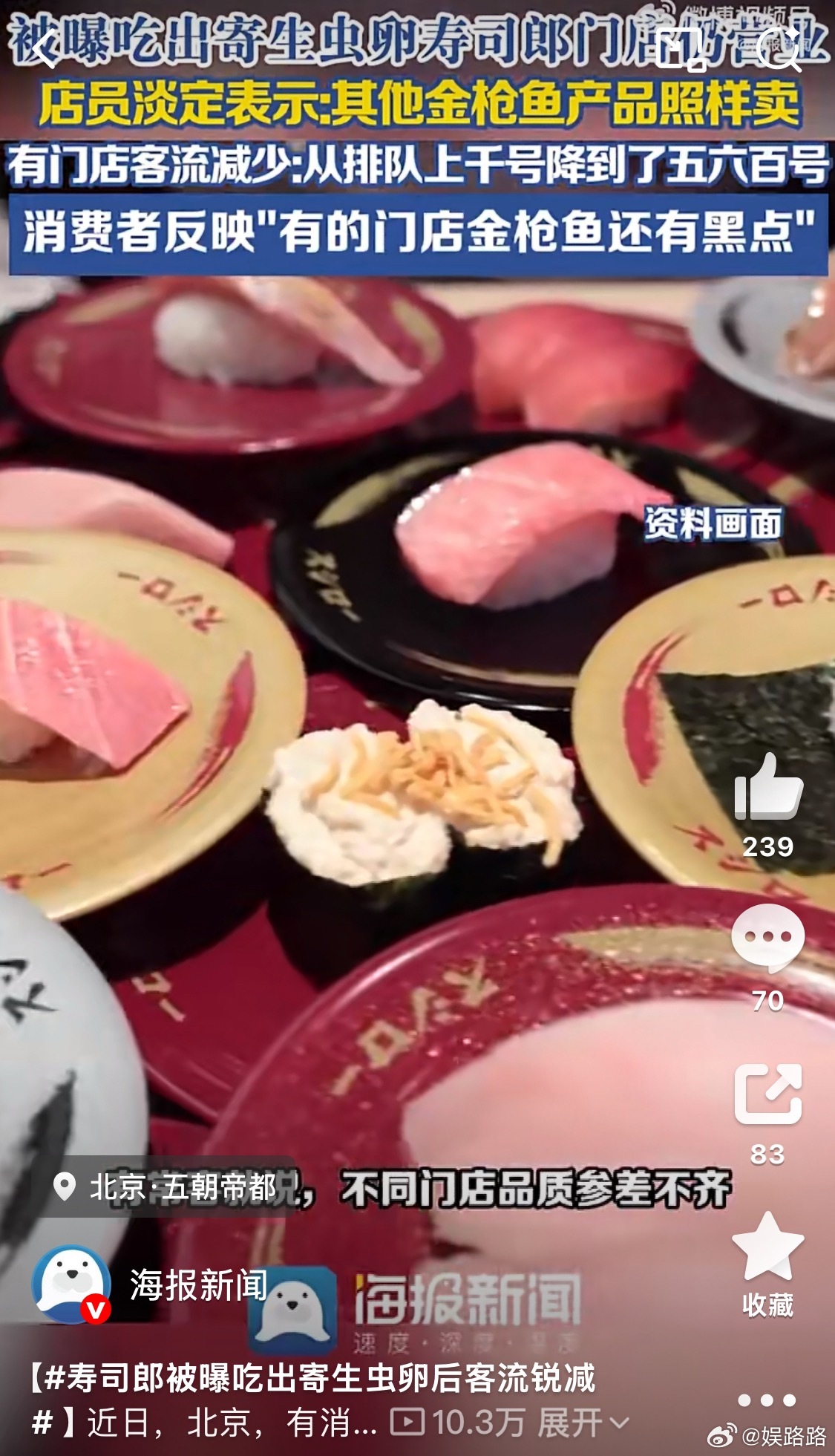 看着门店客流骤降,真的又怕又纠结,以后到底还敢不敢吃刺身了?食品安全真的要狠狠严查啊!🙏 别再让消费者提心吊胆了!寿司郎被曝吃出寄生虫卵后客流锐减寿司郎被曝吃出寄生虫卵后客流锐减
