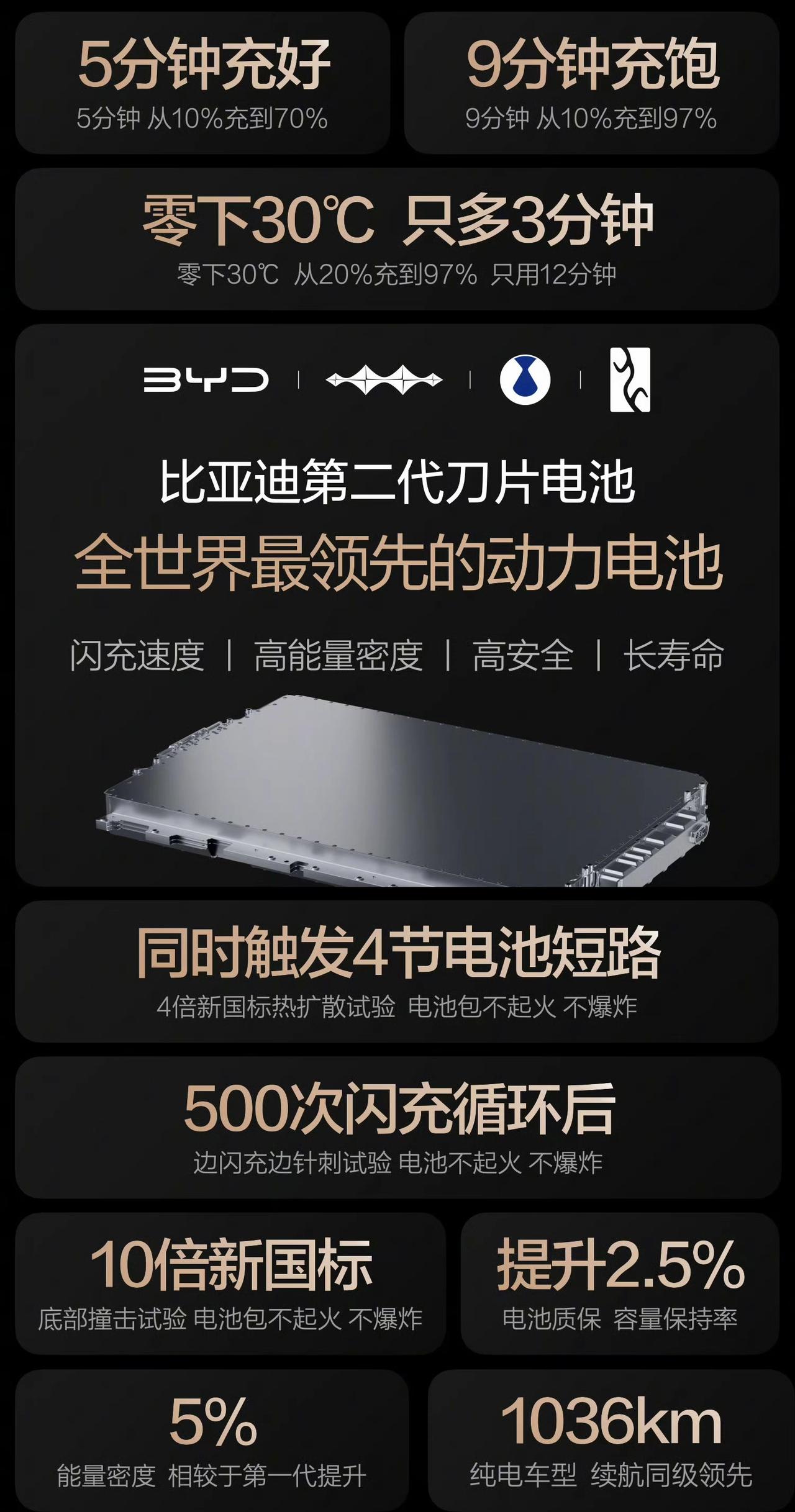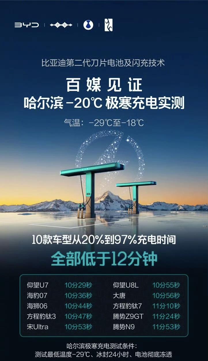 在网上看了不少关于比亚迪第二代刀片电池的讨论,充电速度和电池安全是大家最关心的问题。前几天我去比亚迪六角大楼现场看了常温闪充和低温闪充的表现,真的很震撼~ 常温闪充状态下,钛3仅需8分46秒即可充到97%。低温闪充状态下,大唐仅需10分钟即可充到97%,充电和加油速度一样快,且无惧寒冷,与发布会上王总说的「5分好 9分饱 3分寒」保持一致。 对于车主普遍关心的电池安全问题,比亚迪也给出了完美的答卷。第二代刀片电池创新全链路离子「闪通」技术体系,比第一代刀片电池能量密度提升5%。在经过500次闪充循环后,仍然完成了「边闪充边针刺试验」,安全性看得见。 「充得快+长寿命+高安全」是我对第二代刀片电池的总结,比亚迪用实实在在的产品诠释了什么叫硬核闪充技术树立行业新标杆,造用户所需,急用户所急,才是企业的价值所在。【来自懂车帝车友圈】