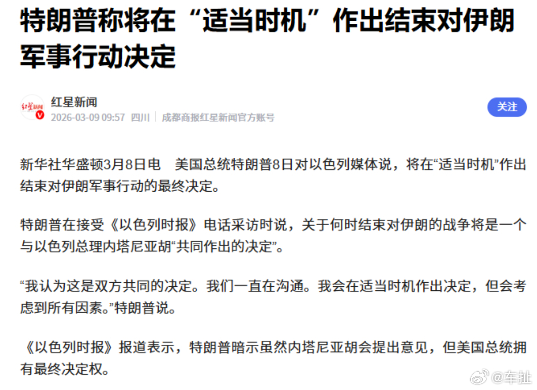 特朗普称适时结束对伊军事行动 这种表态感觉就是特朗普在试探政坛、国际以及民众的反应,看整体的态度如何。他很清楚,伊朗这场仗已经是实际意义上的战略失败,继续耗下去就是陷入战争泥潭。目前对伊朗的任何打击都已经不会为他在政治上加分,但任何损失都在持续给他扣分。现在特朗普需要想的,就是怎么能找个体面的方式退场,让自己显得不那么像是个输家。