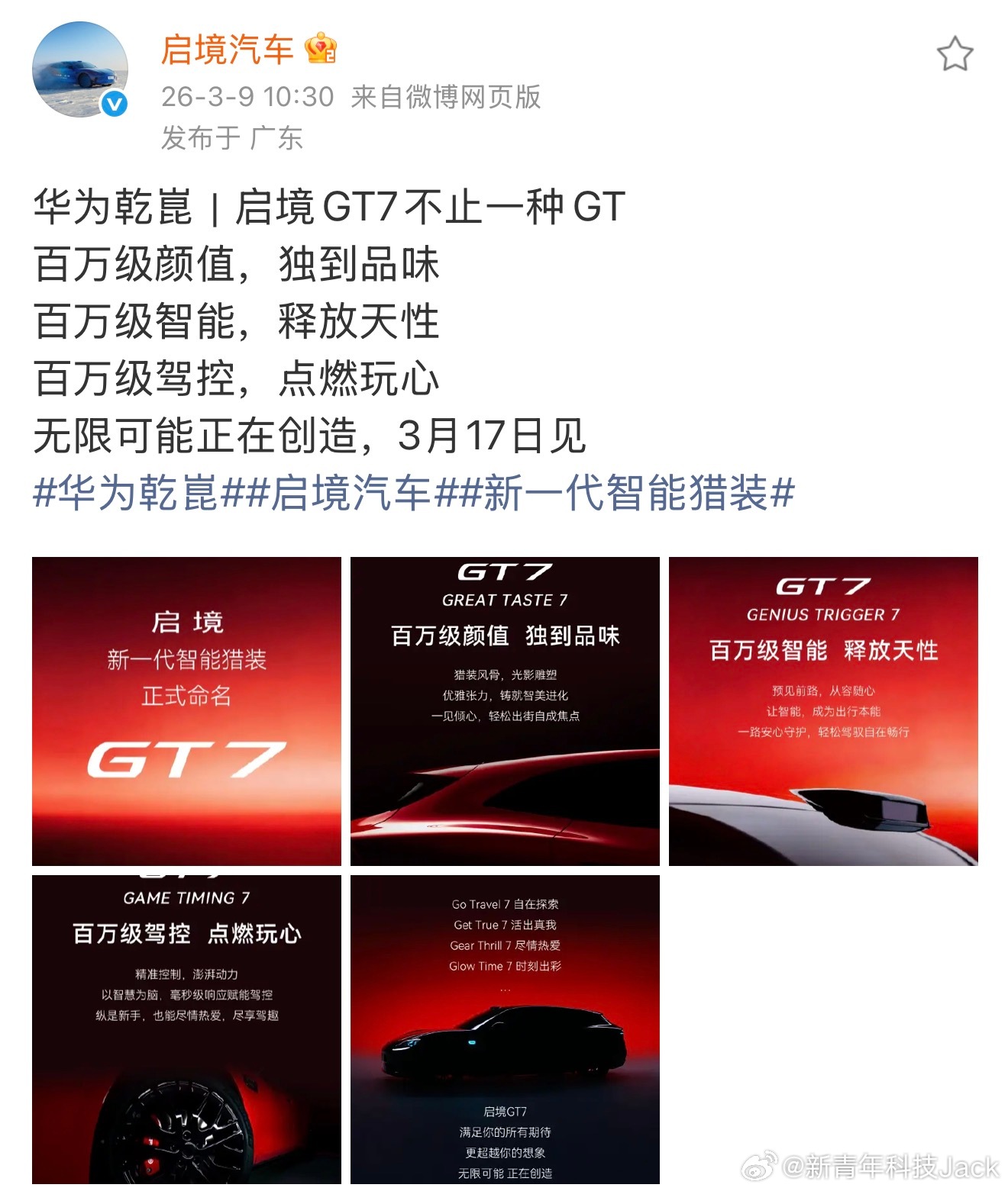 相比于传统GT车型来说,启境GT7更多的是在智能化配置上有越级的体现,广汽联手华为乾崑搭载了全球量产最高规格896线激光雷达,HUAWEI XMC乾崑数字底盘引擎、HarmonySpace鸿蒙座舱,L3级智驾硬件架构;支持五维运动矢量控制,三电机协同提升过弯稳定性。看着配置都是50万以上的水平,这次启境产品力是真的猛!可以期待一下3月17日的发布会亮相,看看启境是如何将用中式智能重新定义猎装的标准!启境官宣首款车型命名GT7