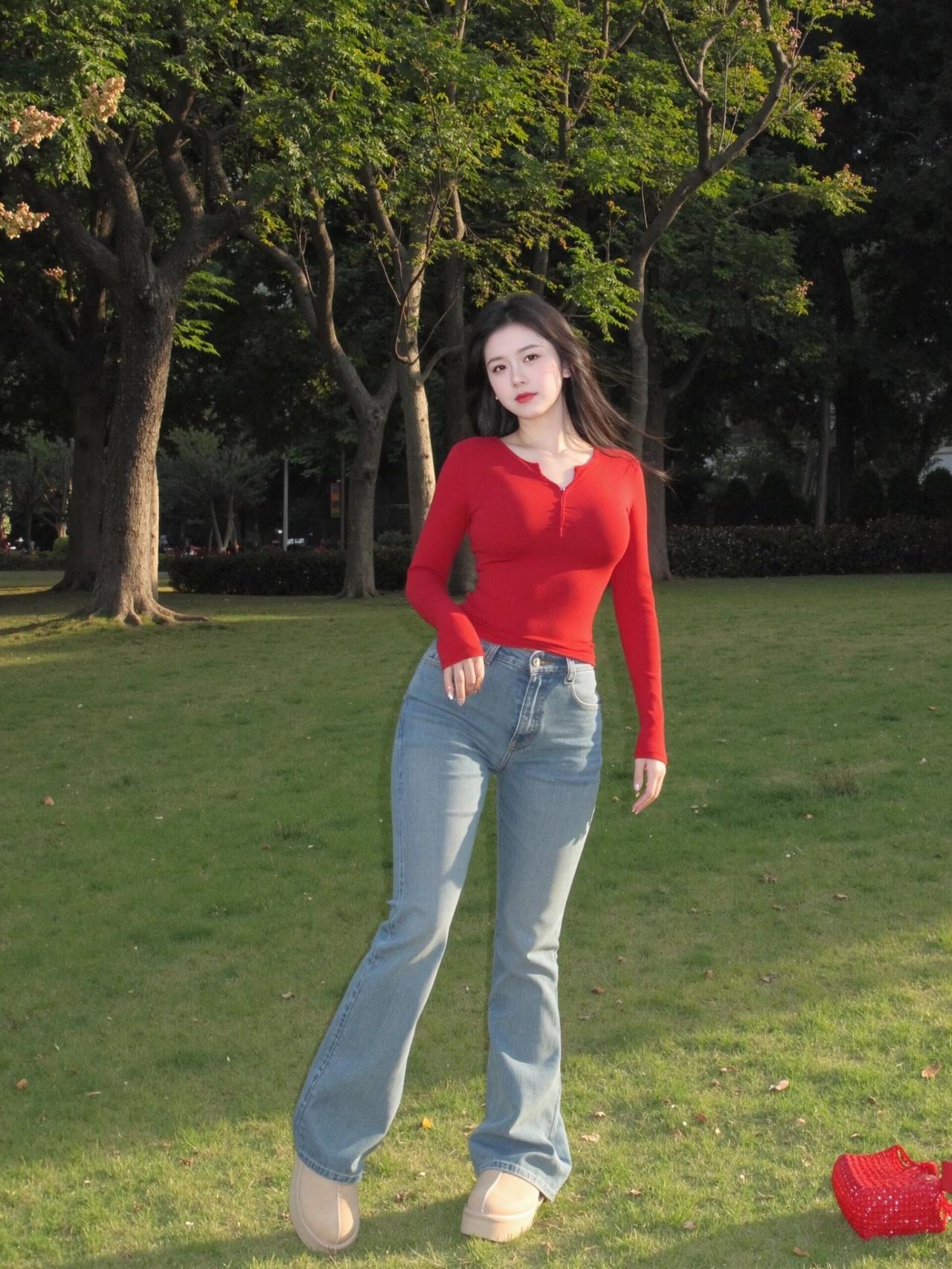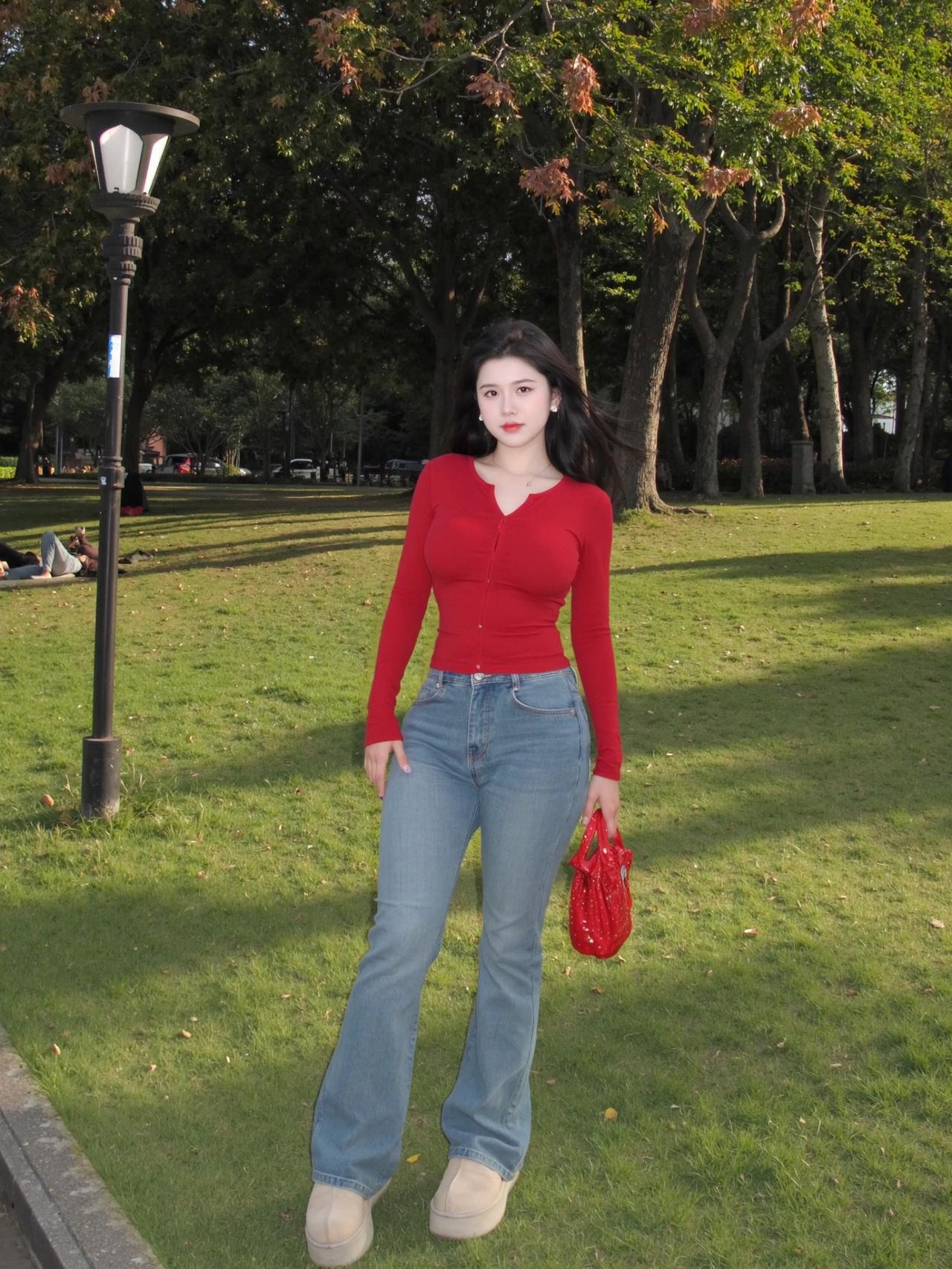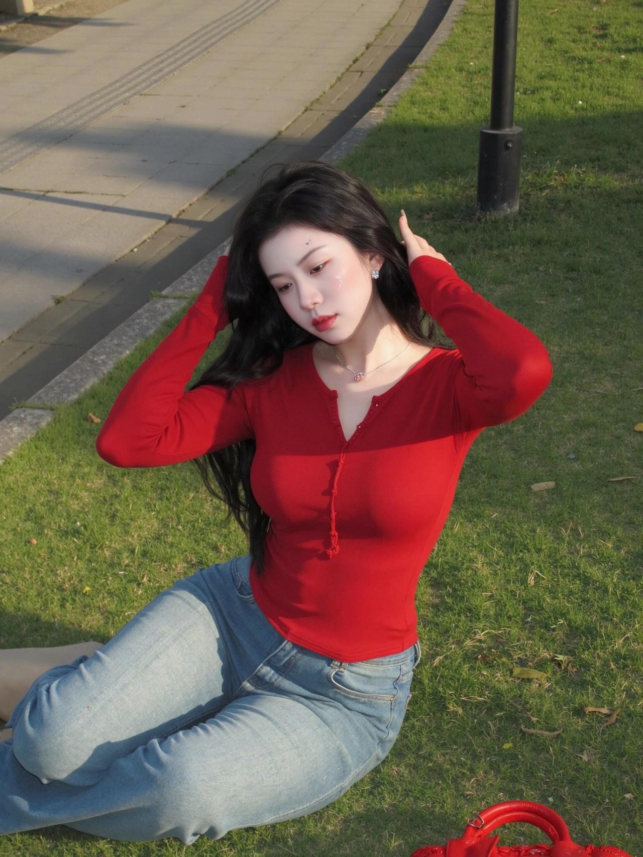 傍晚的草地自带柔光,随便一站都很出片😌 红上衣配浅牛仔真的太显气色了。 贴身红长袖把腰线收得干净利落,整个人挺拔又精神,浅色牛仔刚好中和了亮色的跳脱,耐看又不浮夸。 红配绿一点都不土,反而衬得肤色通透又显白✨ 往草地上一坐,风一吹就很放松,简简单单,就是最舒服的日常记录🍃