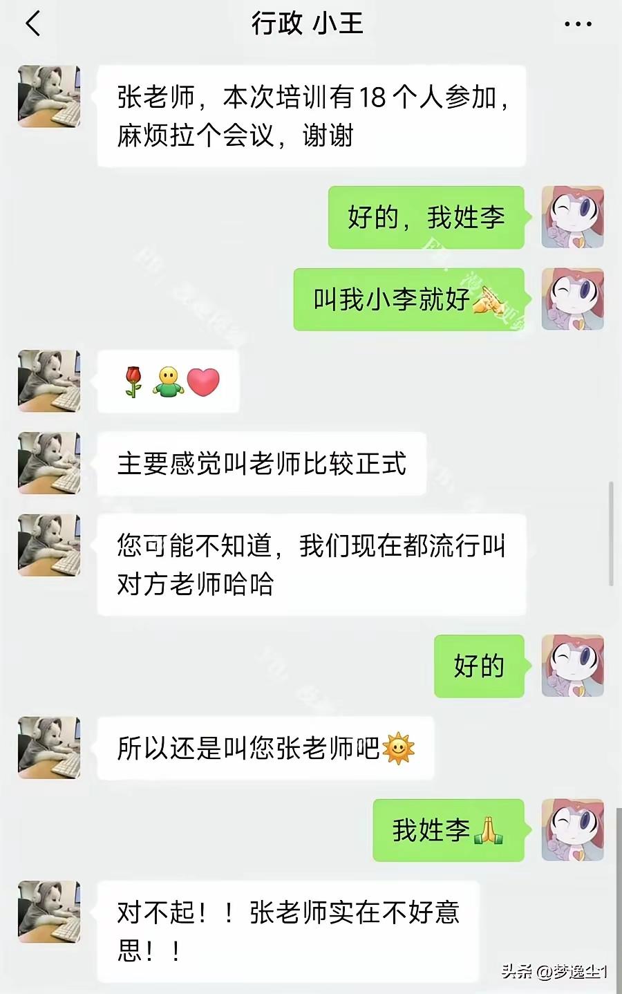 人家报了自己姓李?你非要喊人家张老师?你这是给人家改姓氏啊?微信聊天是文字模式,给人家李老师改姓氏成张老师?无语了啊?