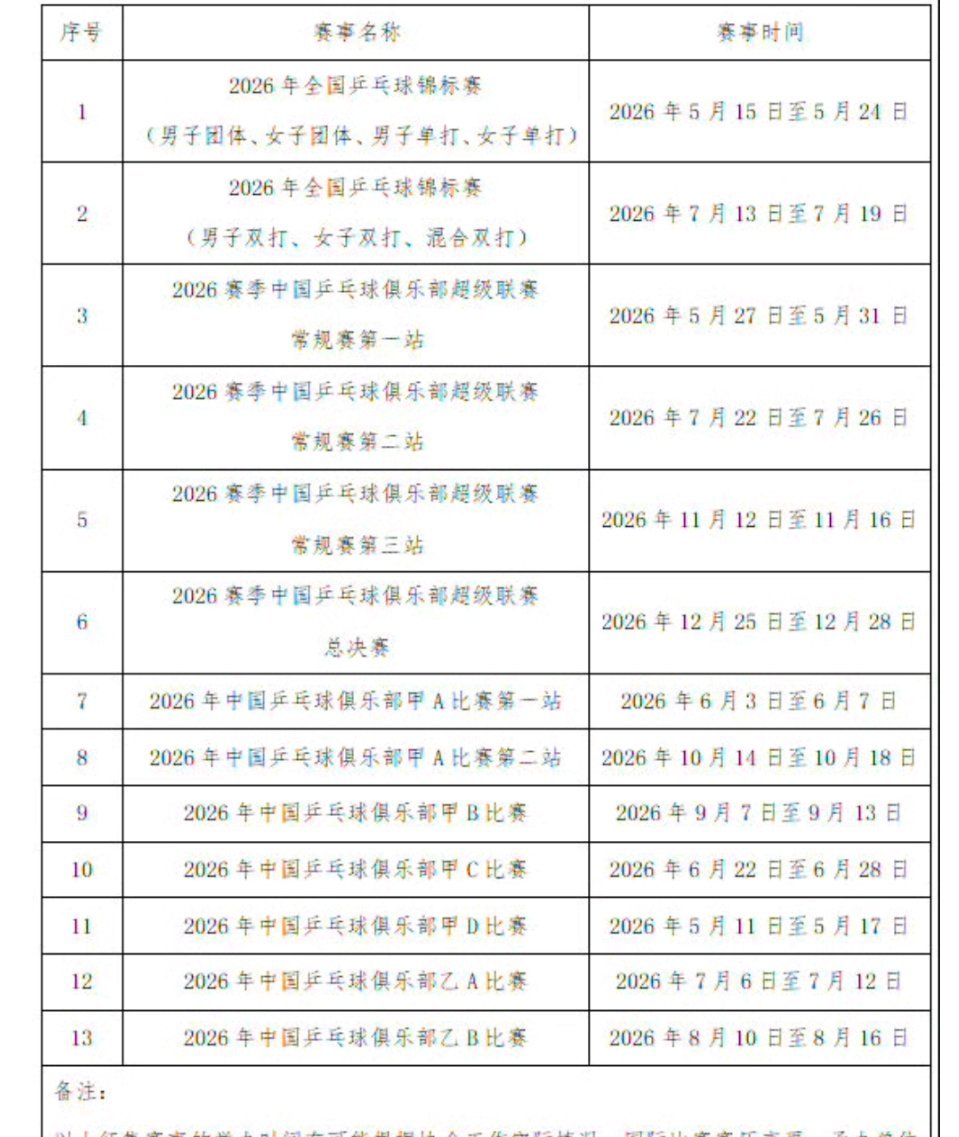 2026乒超赛程正式公布:三站常规赛+年终总决赛,全年国乒赛事日历出炉2026乒超时间确定 中国乒乓球协会正式发布2026年全国乒乓球竞技赛事承办单位征集公告,备受关注的2026赛季中国乒乓球俱乐部超级联赛(乒超联赛)赛程时间正式确定。从5月到12月,三站常规赛与年终总决赛将贯穿全年,同时全国乒乓球锦标赛、甲A、甲B等多项赛事也同步公布了举办时间,为球迷呈现完整的年度观赛日历。近日,中国乒乓球协会发布《关于公开征集2026年全国乒乓球竞技赛事活动承办单位的公告》,正式公布了2026年国内多项顶级乒乓球赛事的举办时间。其中,作为国内乒乓球俱乐部最高水平赛事的乒超联赛赛程安排尤为引人关注,新赛季将采用“三站常规赛+年终总决赛”的赛制,为球迷带来贯穿全年的精彩对决。