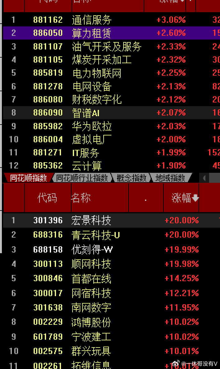 三桶油一回落,大盘情绪就回暖起色了,集中在两个点,其一是周末发酵的AI智能体,养龙虾概念,又新出来的概念,开盘及午后再次崛起,核心龙头的优刻得,顺网,汉得,宏景,首都在线,云赛智联,龙芯中科美格智能等多股领涨,AI涉及到了算力,大数据硬件,IT服务云计算等其二就是算电概念,从智能电网,电网设备,虚拟电厂等受到资金追捧,三变科技快速上板,顺钠4连版了,南网国电南自中超控股,迦南智能德国多股领涨,算力的尽头是电力,不过电力有点偏避险熟悉,更多的是集中在智能电网设备方向抓主要核心方向,远离杂毛