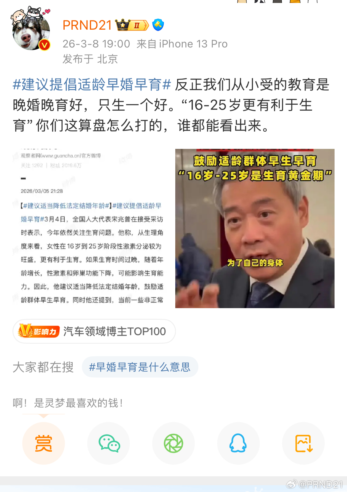 建议提倡适龄早婚早育 反正我们从小受的教育是晚婚晚育好,只生一个好。“16-25