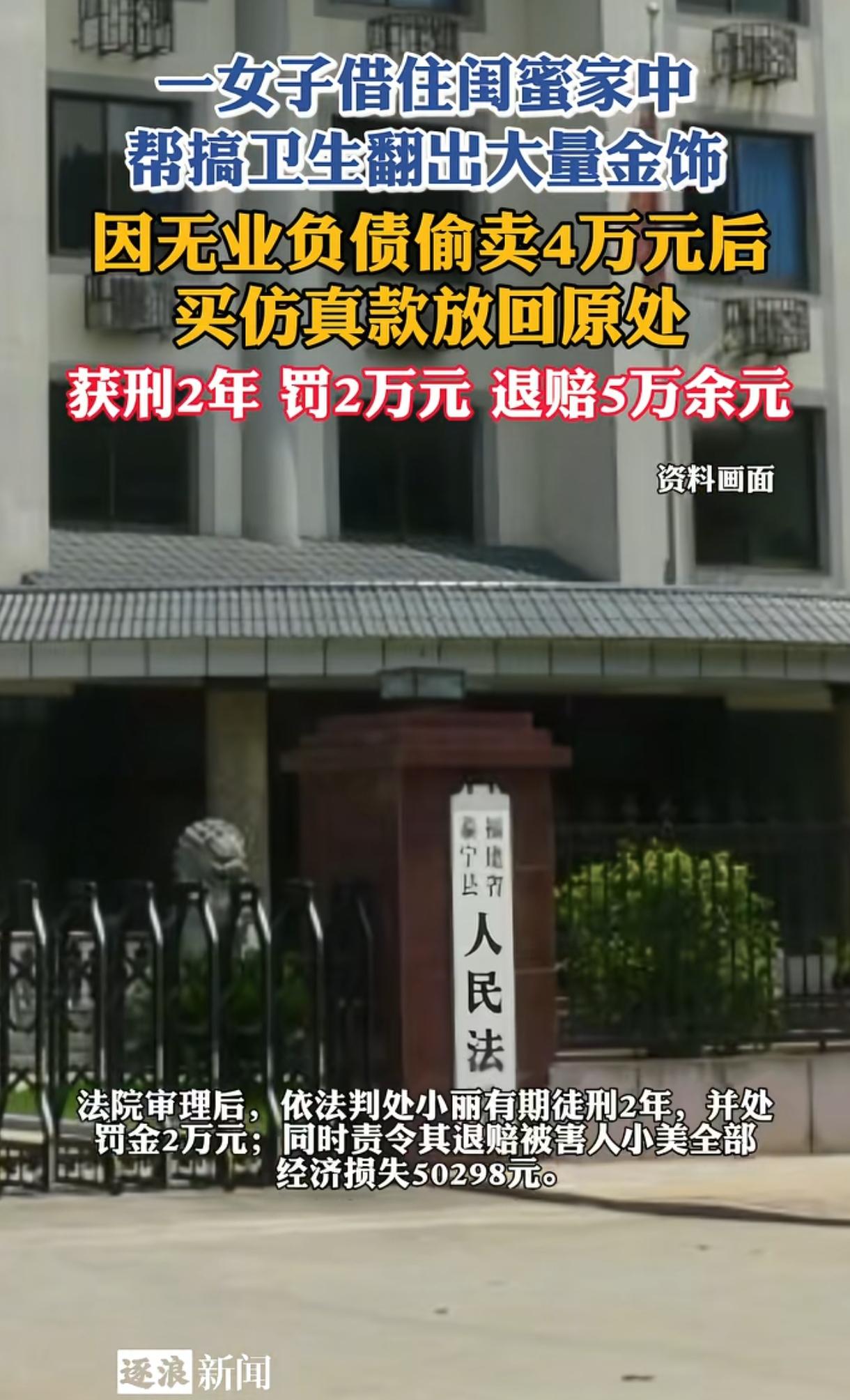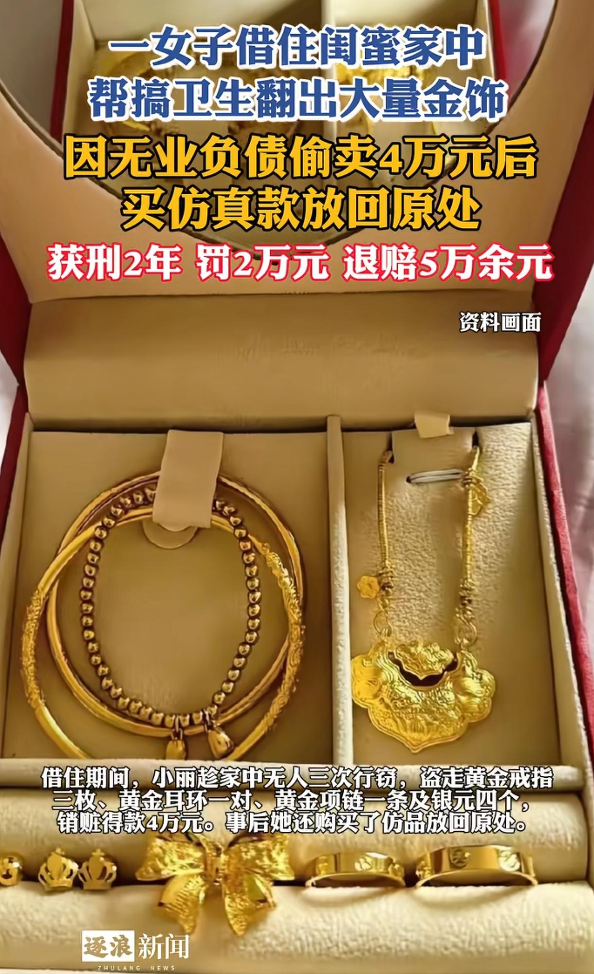 “防火防盗防闺蜜!”福建一女子借住闺蜜家,在打扫卫生时意外发现大量黄金首饰,顿生贪念,分三次盗走变卖获得4万多元,事后又买假首饰放回去。闺蜜察觉异常当即报警,真相水落石出,女子退赔5万、罚金2万,获刑2年,也是罪有应得! (来源:逐浪新闻) 2024年11月,福建泰宁,女子小丽(化名)欠下一大笔外债,又没稳定工作,闺蜜小美(化名)于心不忍,就让小丽住进自己家里。 没想到此举竟然“引狼入室”。 小美家境优渥,居住环境舒适,小丽一住进去就舍不得搬走了,这一住就长达一两个月,小美对她也毫无防范。 11月下旬的一天,小美决定对家里来一场大扫除,小丽也帮忙整理卫生,殊少知这一举动引来了天大的灾祸。 小丽在整理小美卧室时,眼睛不由自主地瞟向了小美未上锁的衣柜抽屉,惊讶发现里面有一堆金灿灿的黄金首饰,心内不禁一动。 这时,小美恰好走向卧室,小丽只好佯装在擦拭衣柜灰尘,小美没察觉异常,也没将抽屉上锁。但小丽已心生邪念了,晚上躺在床上满脑子都是那堆黄金首饰的影子。 为尽快偿还掉债务,小丽决定铤而走险。 第二天,趁家中无人,小丽摸进小美房间肆无忌惮地打开衣柜抽屉,那里面有3个女士黄金戒指、1枚男士黄金戒指、1对女士黄金耳环、一条女士黄金项链、4块银元。 为防止事情败露,小丽并没有一次性盗走黄金,而是分三次将这些首饰悄悄盗走并拿去变卖获得了4万多元,又从某平台购买了仿真首饰放回原处企图“以假乱真”。 这一招闺蜜之间的“调包计”用得比短剧剧情都还狗血。 然而,纸终究包不住火,很快事情败露。 案发当天,小美在整理衣物时,发现衣柜抽屉有异常,拿出首饰试戴时感觉手感不对,没有真金沉甸甸有质感,便将首饰拿到金店确认,果然抽屉里的全是假首饰。 小美惊愕不已,她以为是晚上家里来了小偷调包走了那些黄金首饰,根本没往闺蜜身上想,当即就报了警。 警方赶来,勘查了现场,没有外人入室痕迹,怀疑熟人作案;又查看了小区监控,发现借住者小丽穿着红色衣服出现在单元门口,遂锁定她为嫌疑人。 之后警方又查到小丽在某平台购买假首饰的订单记录凭证,还有小丽盗取黄金变卖4万元的转账记录。 这下铁证如山,当天小丽就在屋里被抓获了。面对铁证,她只得供认不讳,交待了盗窃、调包、销赃等的全过程。 小美万万没想到“千防万防、家贼难防”,何况对方还是自己十分信赖、自己又全心帮助的好闺蜜啊。 2026年3月初,此案审结,落下帷幕。 小丽因犯下盗窃罪,数额巨大,被从重处罚,退赔小美经济损失50298元,处罚金2万元,获刑2年。 不得不说,小丽真是太糊涂了,两人是关系要好的闺蜜,为何要行盗窃之举呢?如此无视法律,害人害己,得不偿失啊。 闺蜜让你借住,你非但不感恩,反而背后捅刀子!做人要感恩而非恩将仇报!无论经济压力有多大,都不能成为漠视法律、剑走偏锋的借口,否则将受到法律严惩! 这案例也给人警醒: 人与人一定要有边界感,千万不要往家里带人,闺蜜也好,朋友也罢,切忌引狼入室酿下祸端,否则上演“家夫与蛇”的悲剧,悔之晚矣!