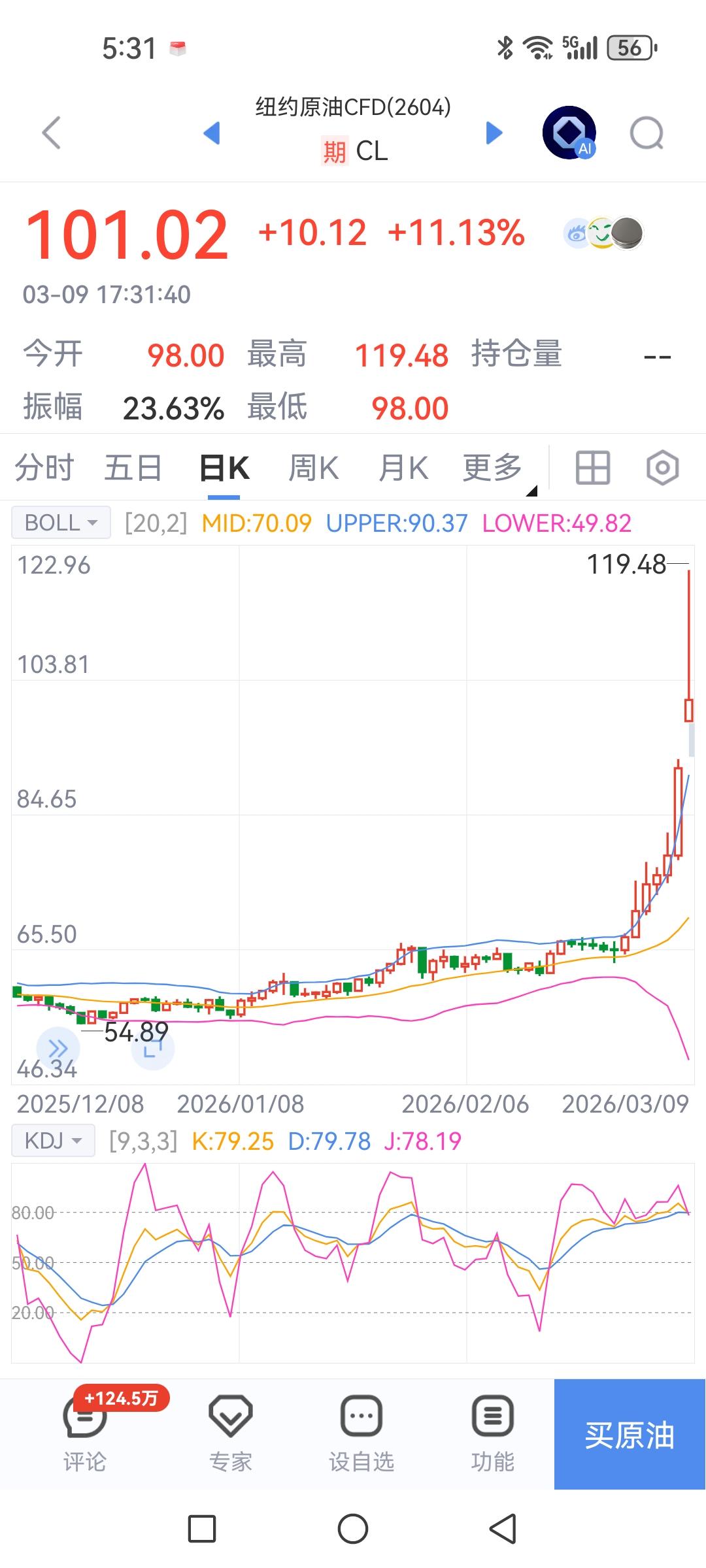 原油期货让人开天眼了,你们玩吧。 一天最高涨幅到大30%左右,期货多单要赚成啥样,空头又要爆掉多少?这里不是爆富就是爆亏,玩的都是心跳,贫富运气全凭那老头一句话。 据消息那老头又在喊话适时结束战争,只不过新上任的头领未必会领情,但也说不准。虽然家人和国人都遭到重创,但国力能够坚持继续打下去吗? 一旦出现意外的局面缓和,原油期货价格势必大幅下跌。相反,凭着血气再反击一段时间,搞得大家鱼死网破,那么原油期货价格继续暴涨,也不是没有这种可能。 所以,在油气期货和股票上的博弈都是赌运气,我等散户就是个看戏的。但是,对于A股的一些低位价值股,个人仍然坚定信心,毕竟要相信国家实力,而且稳定和安全环境必然成为世界资金的避风港。