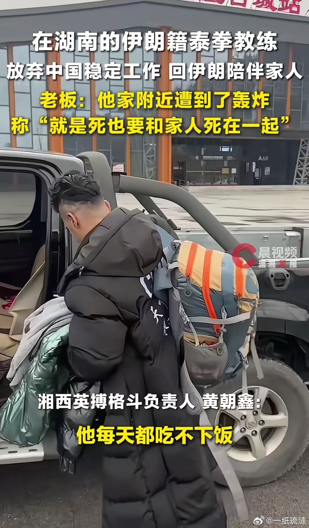 看了这条新闻太难受了。湖南湘西有一位伊朗籍泰拳教练,本来在中国有个稳定的工作、稳定的收入,新闻里提到他每个月几千块的收入,还包吃住。他非常节俭,只给自己留三四百块钱,剩下的大头全部打给家里人。上个月28号,伊朗战争爆发,他联系了家人,得知家附近遭遇了袭击,很担心家里人,每天担心的吃不下饭。然后这位伊朗籍泰拳教练选择辞职回国,说自己死也要和家人死在一起。如果战争结束了,自己家里人相安无事,还会回中国。他老板给他买了北京飞土耳其的机票,到土耳其后他再想办法回伊朗。明知家乡在战火之中,非常危险,他还是毅然决然地选择回到家乡、回到家人身边,这就是拳拳爱国情悠悠赤子心啊。战争,受到伤害最深的永远都是平民老百姓。一直祈祷世界和平,但是很无奈。伊朗 、新闻 、世界和平