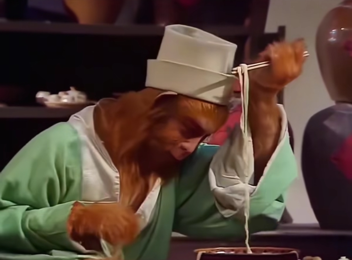 《西游记》中吃面条名场面 在同一家店里一起吃面条 为什么这个老头的面条一挑就断 貌似整碗面条都是坨的 而猴哥的面条用筷子挑起来老长一根 害得猴哥要站在桌子上吃 还被这老头儿嘲笑 难道是店家小二觉得这猴子不好惹 所以给猴哥新下的面条 还是剧组为了剧情需要刻意这么安排的呢?