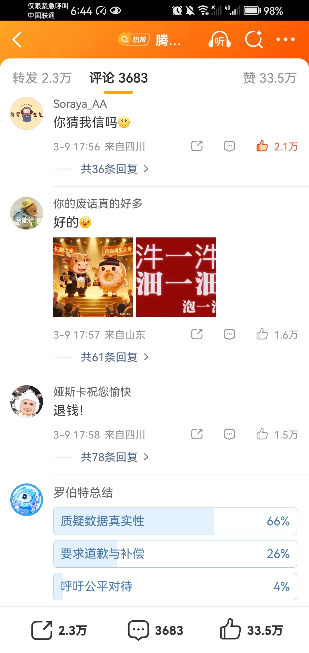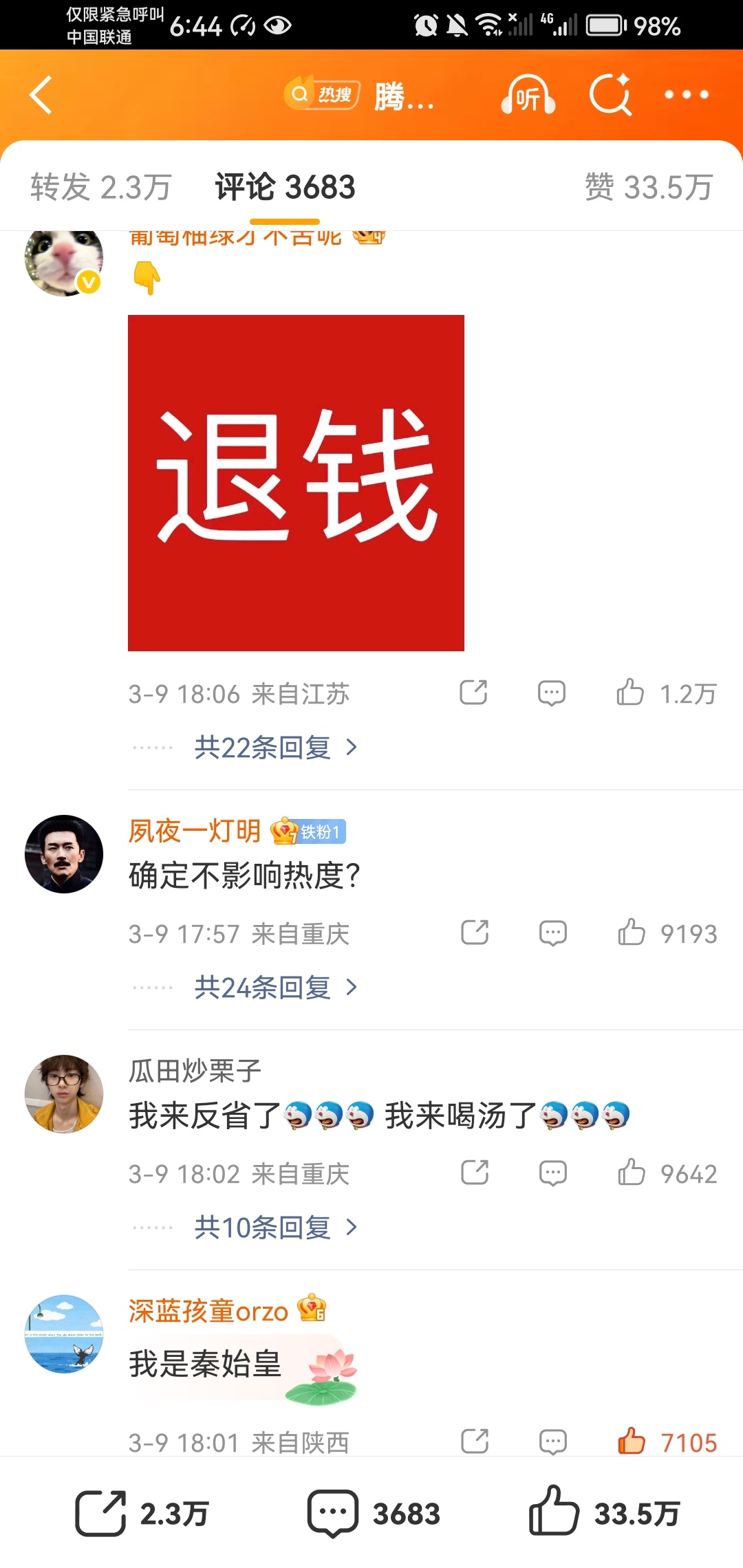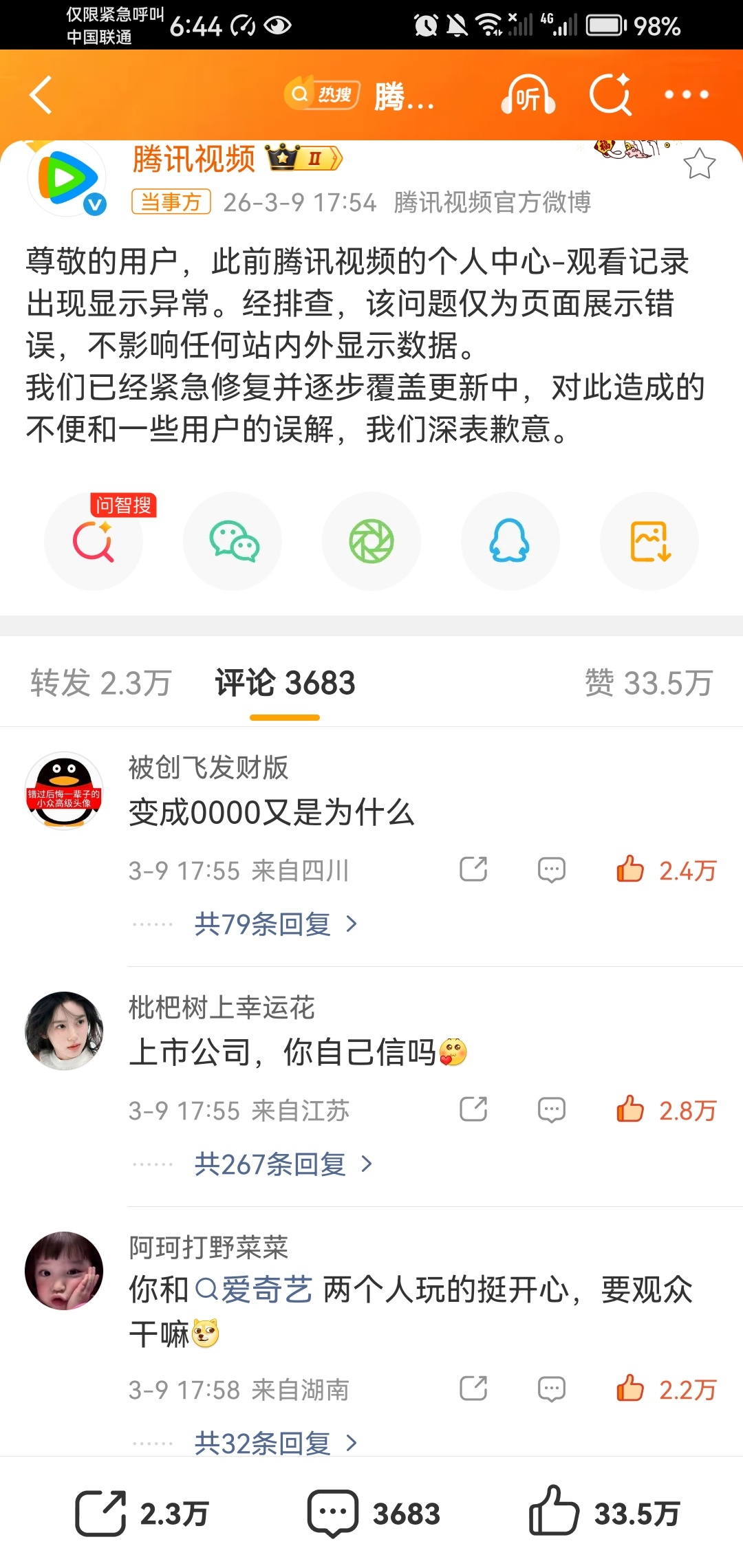 天大的热闹,腾讯评论区一水儿喊退钱,爆剧粉都噶了吗?控评都控不过。这样看来确实是假爆。腾讯视频回应播放异常