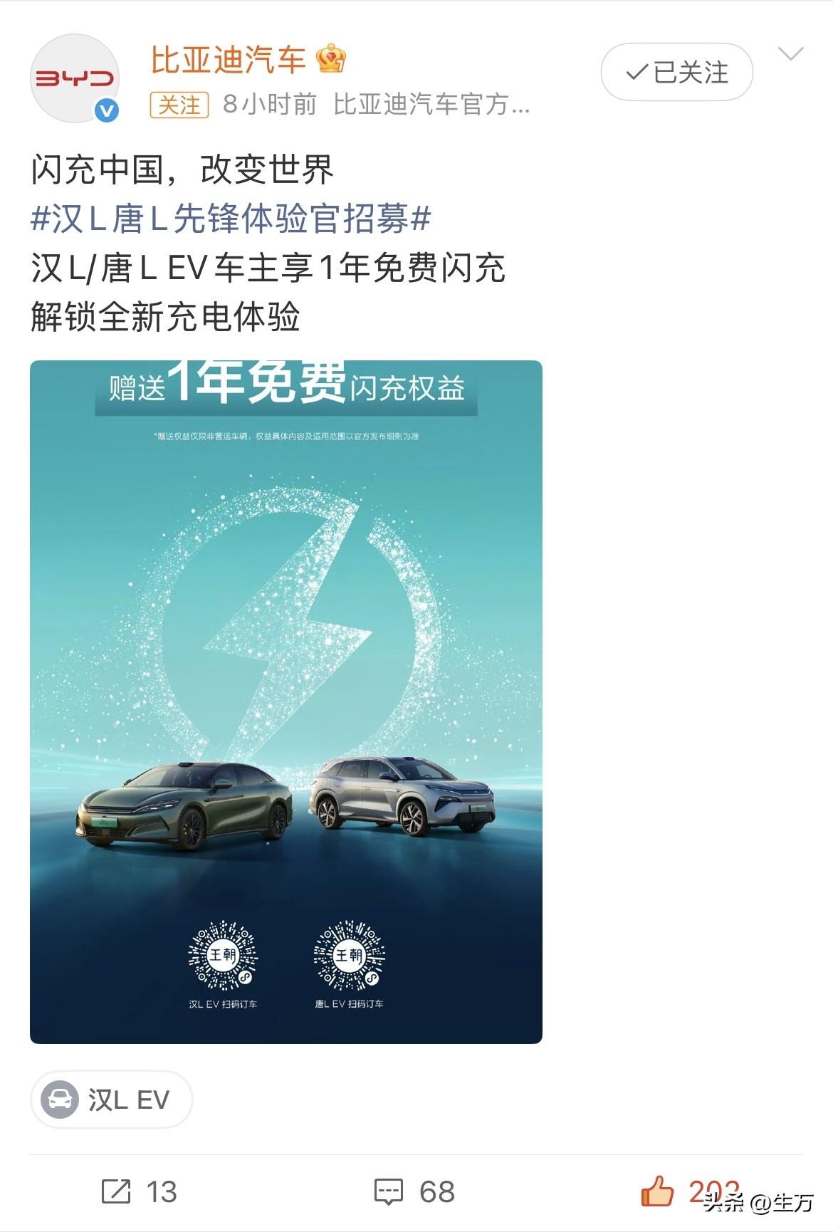 比亚迪静悄悄的给汉唐老用户免费充一年电! 比亚迪这次真的在用行动,宠爱自己的用户! 今天早些时候,比亚迪官方根本没怎么宣传,就发出来这样简单的海报,这条消息从今天早上发出来到现在,评论的人只有几十个,这说明比亚迪并没有想把这个事情作为一个专门大张旗鼓的宣传。 之所以现在形成了一个热搜,是因为今天晚上的时候,越来越多的比亚迪汉和唐的车主,慢慢地发现了这个事情,既然慢慢地在比亚迪的车主圈子里面传开。 因为这个事情,前两天王传福在开第二代刀片电池发布的时候,并没有单独拿出来说,所以很多老车主还不知道这个事情,毕竟免费充一年电,这是实实在在的投入,这两个品牌的用户基数是很大的,不知道这一年免费充电大概会投资多少钱,再×这么多的用户可想而知背后这个数字,他一定是一个天文数字。 现在看到这条消息还没有操作的车主,可以根据官方的提示去一步步操作了,有时候觉得比亚迪这个品牌真的是比较低调,要是换作其他的品牌,这个事情估计得连续说好多天[捂脸]