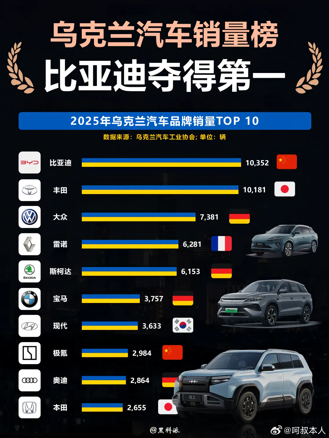 比亚迪在乌克兰击败丰田,成了全年销冠!俄乌都干4年多了,能被乌克兰用户认可的东西,难怪前两天以色列那台被炸的元PLUS一点事儿没有。乌克兰消费能力不算高,一年也就8万台的市场,销量前10的车基本都是油车,只有BYD是新能源,因为欧洲新能源都很贵,所以BYD刚好就补了这个空缺,这趋势就像前几年的国内市场一样,传统品牌基本都还是油车,正在遭受国产电车的冲击。比亚迪新能源汽车国产车大v聊车电车出海
