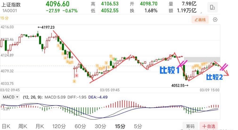 2026.3.9周一收评: 探底回升,调整结束了?后续怎么走? 上证指数走势总体还是符合预期的,短期基本上就是围绕上(5/10/20)和下(60)日线区间震荡,这种震荡会使得上下均线向右边延伸,均线就会慢慢收敛汇合,一旦均线重合就预示着变盘!那么后续比较重要的还是能否突破均线向上走。往下比较关键的两个支撑,一个是60日线,一个是4002(颈线)基本上这个位置很难被跌破。所以,走势相对也比较清晰,往下走不用去害怕。 走势结构上,如图所示,明天大概率还会有一笔拉回的向下走势,可比较前后两段的下跌力度,只要不走加速向下,力度弱于前段,则可寻求个股低吸机会。交易战法,只要是符合强势特征的,按照自己的节奏!不要被指数所影响。 个人观点,仅供参考!
