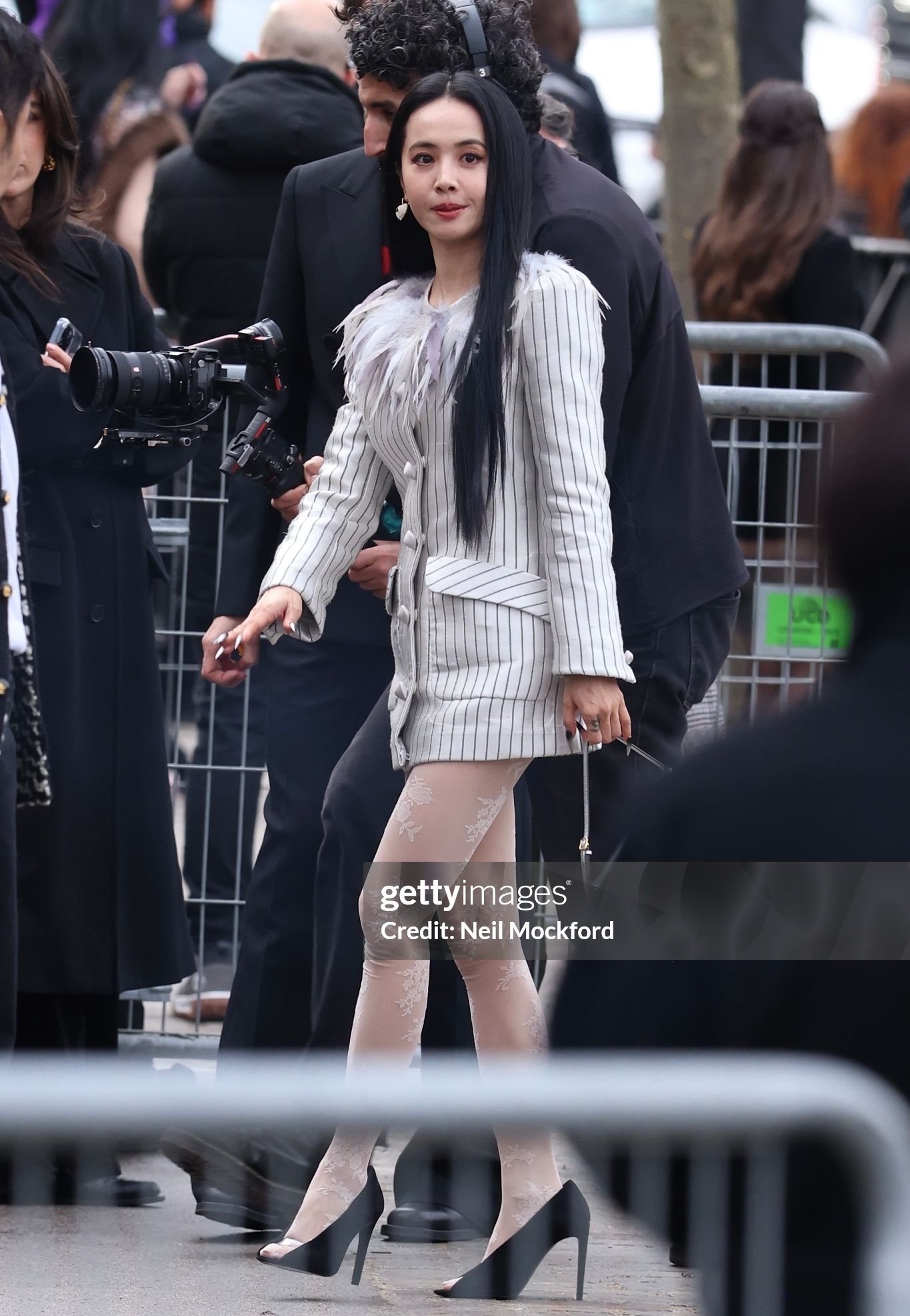 刘亦菲抵达巴黎看秀茜茜公主白色蕾丝包臀短裙黄色细高跟