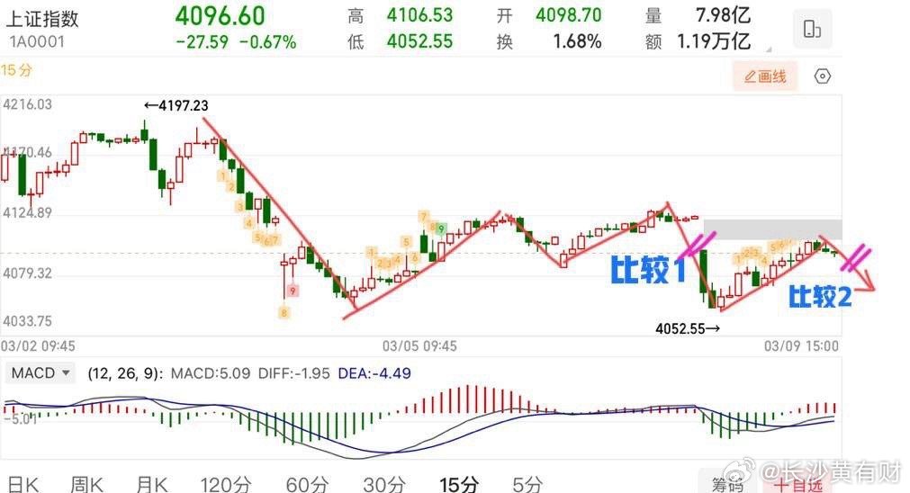 2026.3.9周一收评: 探底回升,调整结束了?后续怎么走? 上证指数走势总体还是符合预期的,短期基本上就是围绕上(5/10/20)和下(60)日线区间震荡,这种震荡会使得上下均线向右边延伸,均线就会慢慢收敛汇合,一旦均线重合就预示着变盘!那么后续比较重要的还是能否突破均线向上走。往下比较关键的两个支撑,一个是60日线,一个是4002(颈线)基本上这个位置很难被跌破。所以,走势相对也比较清晰,往下走不用去害怕。 走势结构上,如图所示,明天大概率还会有一笔拉回的向下走势,可比较前后两段的下跌力度,只要不走加速向下,力度弱于前段,则可寻求个股低吸机会。交易战法,只要是符合强势特征的,按照自己的节奏!不要被指数所影响。 个人观点,仅供参考!