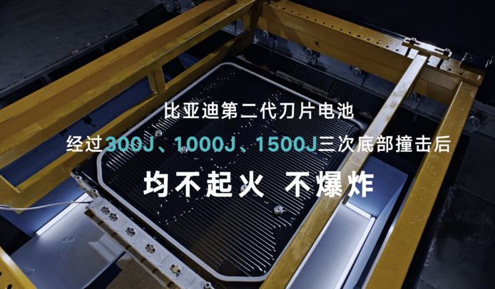 在热扩散试验中,新国标要求触发1节电池热失控,不起火不爆炸即可;而第二代刀片电池挑战同时触发4节电池短路,周围电芯依然保持正常温度,未引发热扩散,无起火、无爆炸,以超越国标的表现证明极端情况下的安全性。此外,针对底部撞击场景,第二代刀片电池成功挑战10倍新国标撞击能量的底部撞击试验,即便电池包因车辆磕底而受损,依然保持不起火、不爆炸,为用户提供全生命周期的安全保障。