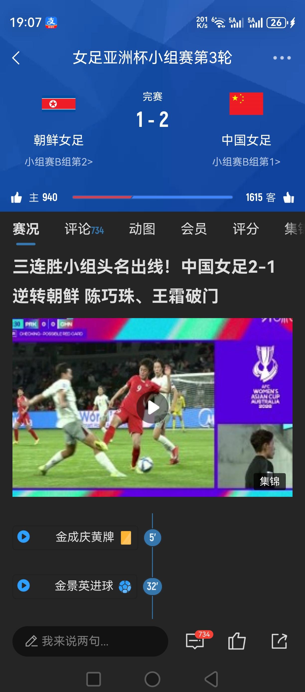 哇哦!王霜进球!中国女足2:1!战胜朝鲜!小组头名![赞][赞][赞][赞] 逆转!中国女足太坚韧了!落后时也没有慌乱!全队整体进攻,整体防守!这是团队的胜利! 头名出线,四强打台北!胜了,就进世界杯了! 了不起![赞][赞][赞][赞][赞]