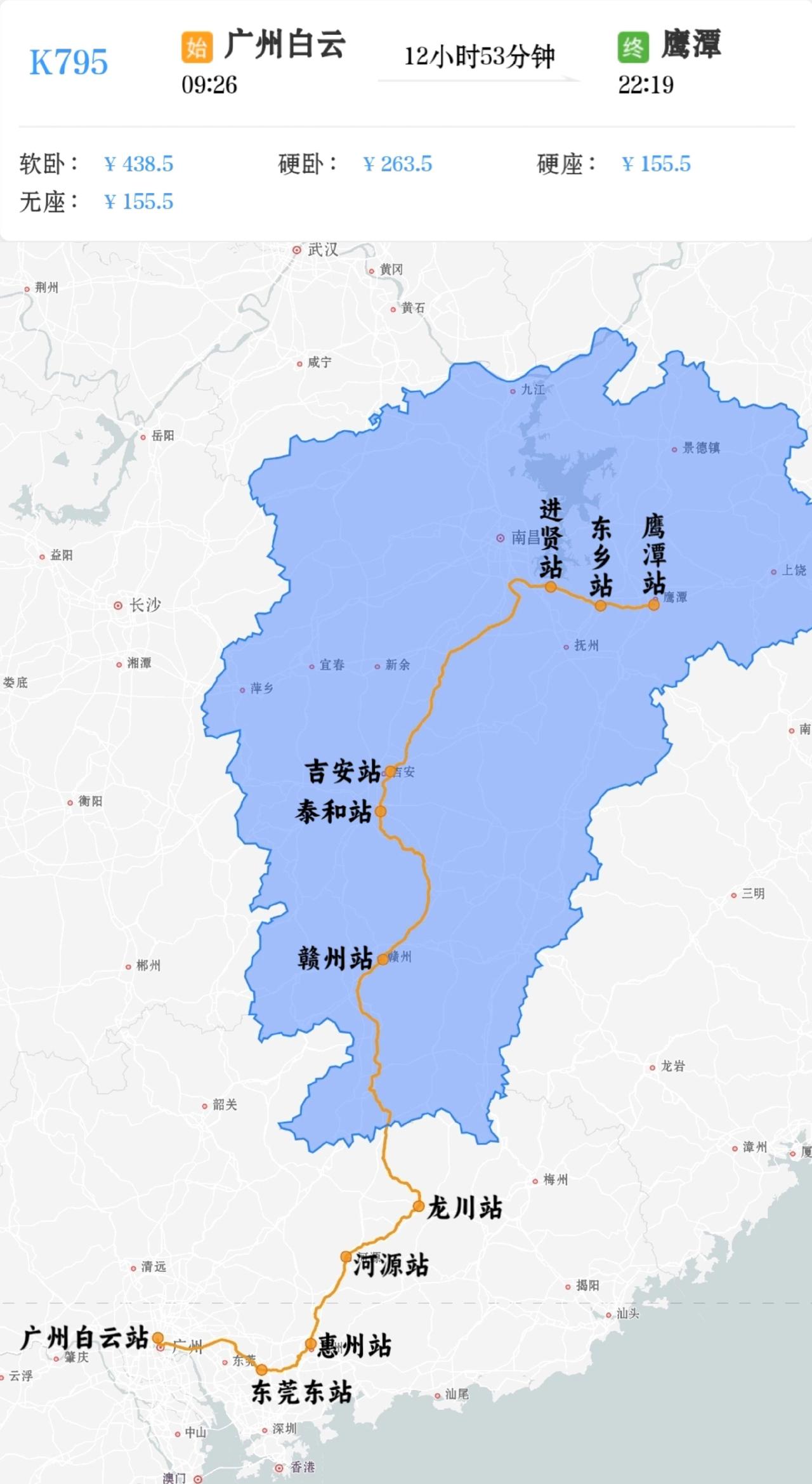 广州、东莞到鹰潭朝发夕至 广州白云到鹰潭K795/K794次 广州白云站9点26分开,东莞东站11点05分开,当天晚上22点19分到鹰潭站,用时12小时53分钟。