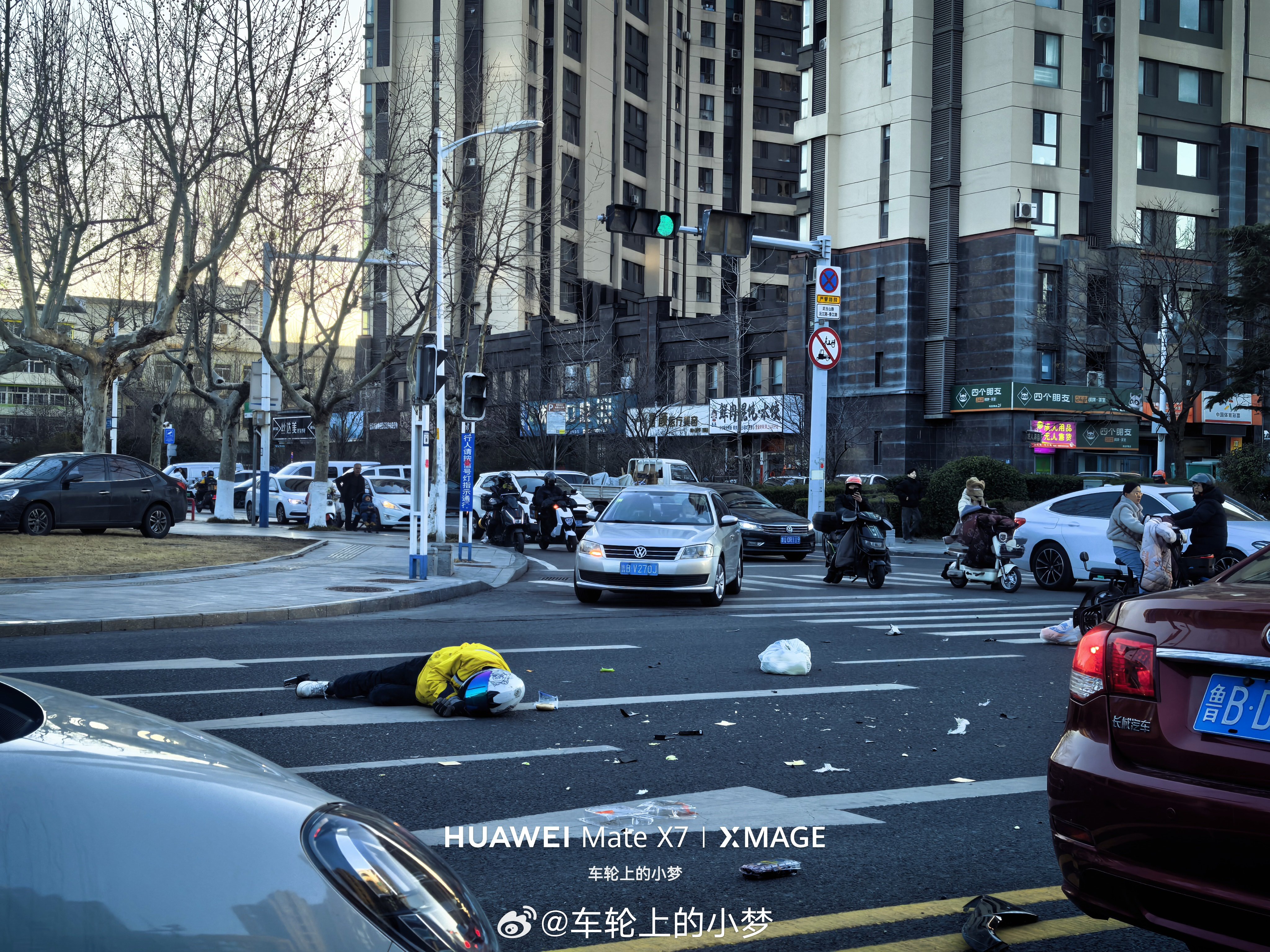 心里还在犯嘀咕 (从来没想到会发生车祸)往旁边一看,一个外卖员滚了过来,停在了路上…………