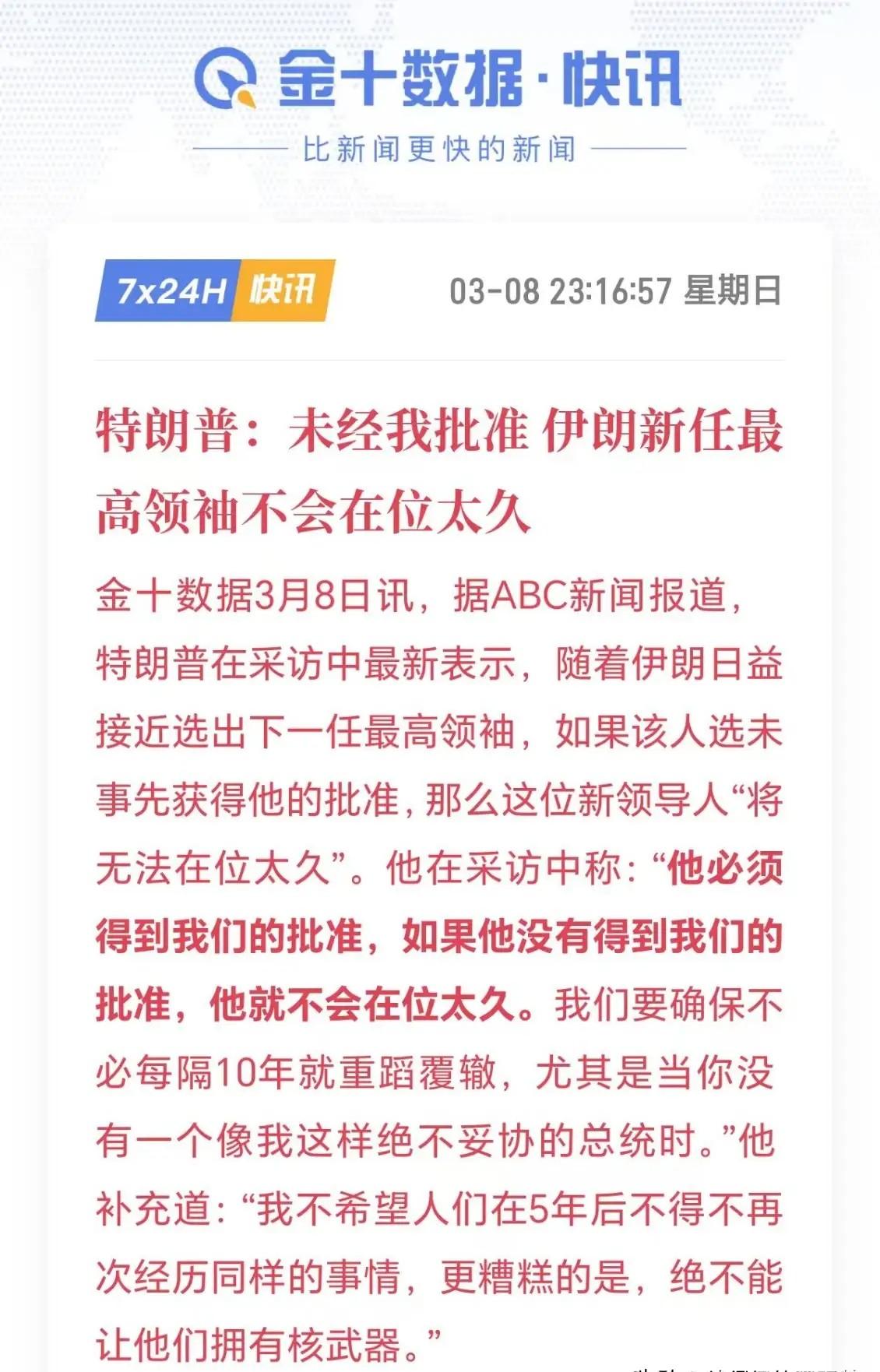 伊朗选出新最高领袖小哈梅内伊,特朗普气得要暴跳如雷了吧! 据ABC新闻报道,在伊朗尚未选出最高领袖之时,特朗普曾发出威胁,声称若该人选未提前获得他的批准,那么这位新领导人“在位时间不会长久”。 这强盗嘴脸实在是丑陋至极!如今,哈梅内伊的次子小哈梅内伊当选伊朗最高领袖,特朗普之前的大话岂不是狠狠打了自己的脸!