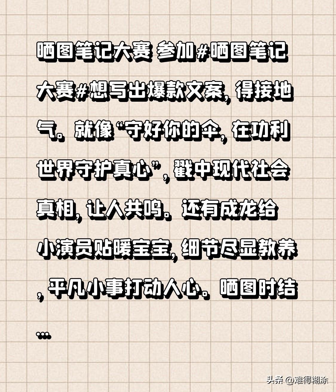 晒图笔记大赛 参加晒图笔记大赛想写出爆款文案,得接地气。就像“守好你的伞,在功利世界守护真心”,戳中现代社会真相,让人共鸣。还有成龙给小演员贴暖宝宝,细节尽显教养,平凡小事打动人心。晒图时结合生活感悟,分享真实情感,说不定流量就来了!