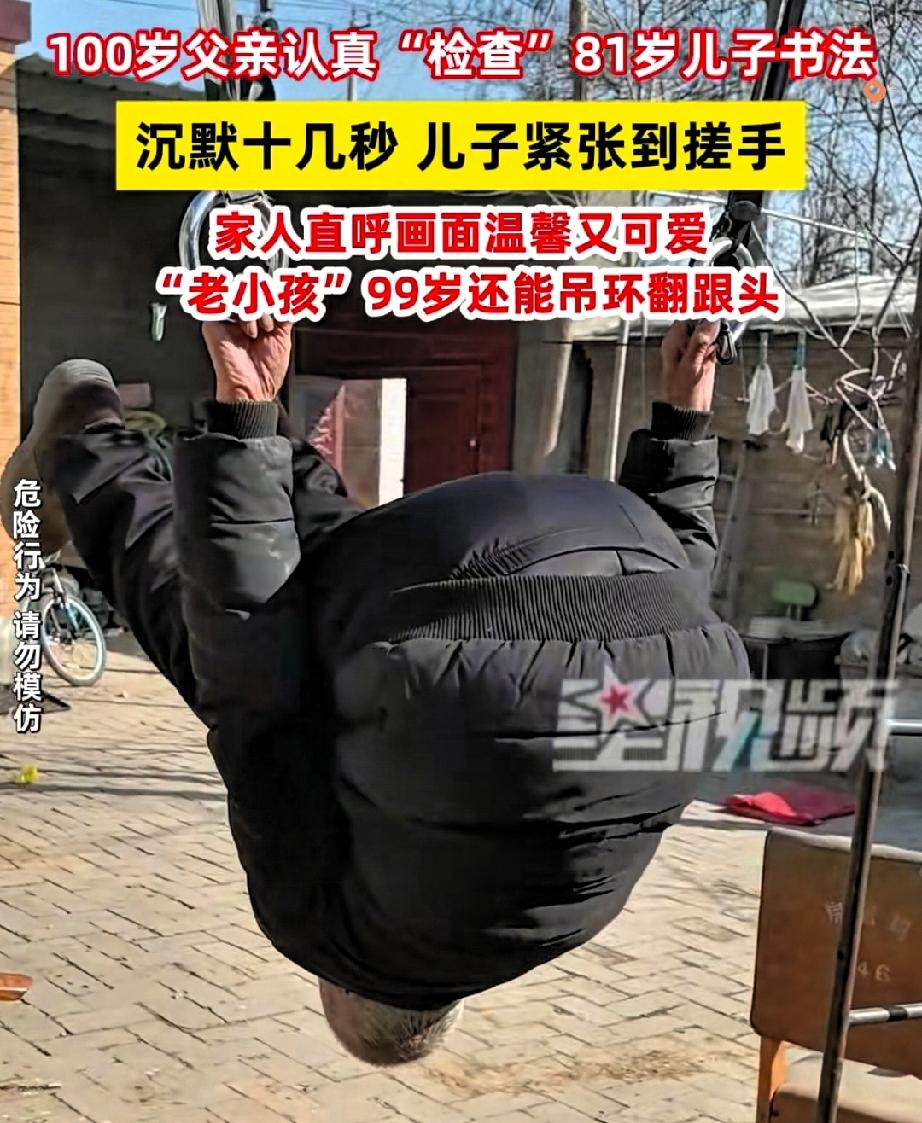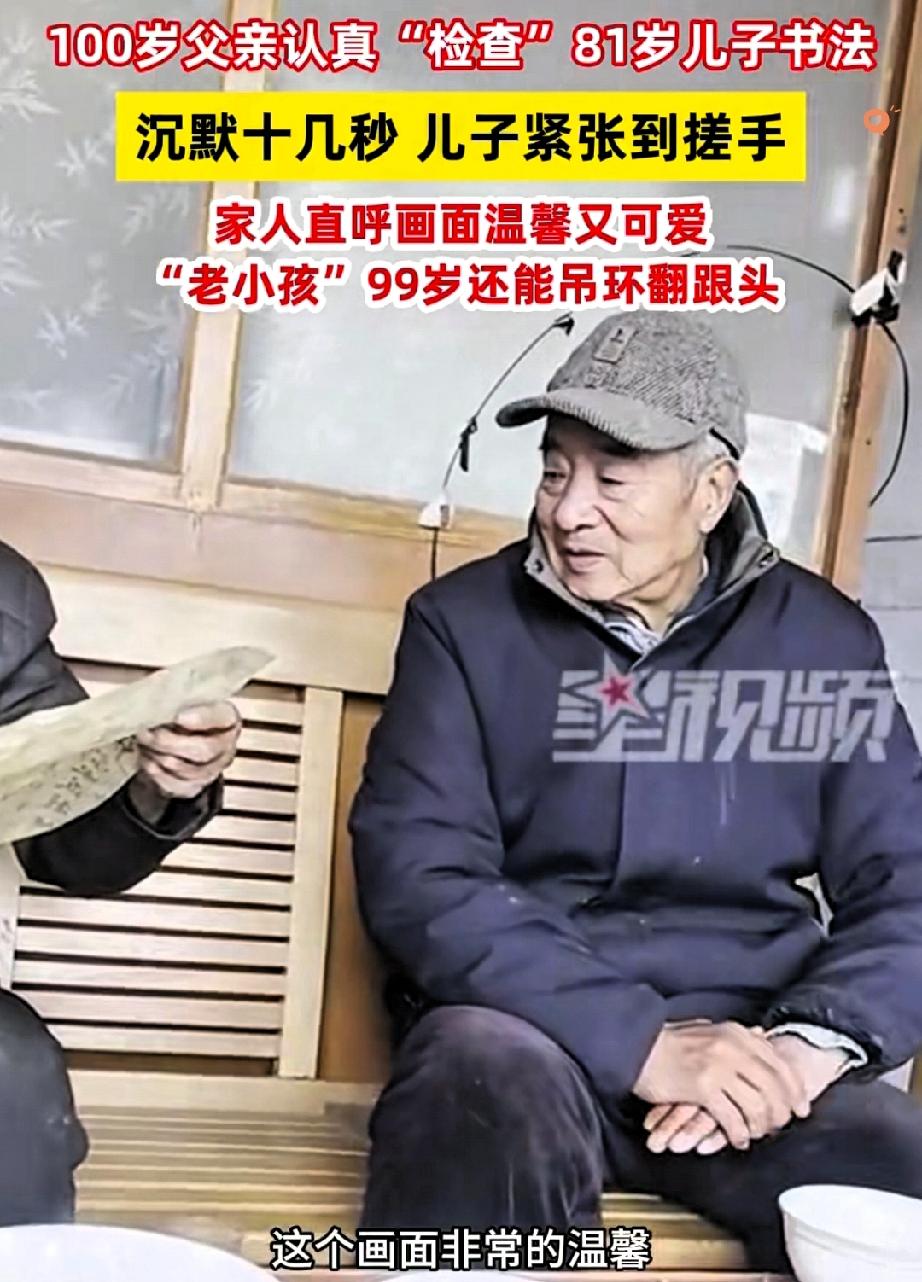 这才是顶级幸福! 河北保定,81岁老人给100岁父亲递书法,竟紧张到不停搓手,这一幕看哭无数人。 3月9日,老人趁着父亲吃饭,把新作恭恭敬敬递过去。 老父亲筷子都没放,就认真“审阅”起来。 前一秒还满心期待夸奖,后一秒被父亲的严肃拿捏,瞬间变回忐忑的小孩,搓手的样子又可爱又戳心。 这哪里是查书法,分明是父爱最鲜活的模样。 我始终觉得,人这辈子最大的底气,就是活到八十多,还有人能让你紧张、给你把关。 这份敬畏与依赖,比任何书法作品都珍贵。 所谓岁月静好,不过是百岁父亲尚在,八十岁儿子仍可做孩童。 你身边有这样戳人的亲情瞬间吗?