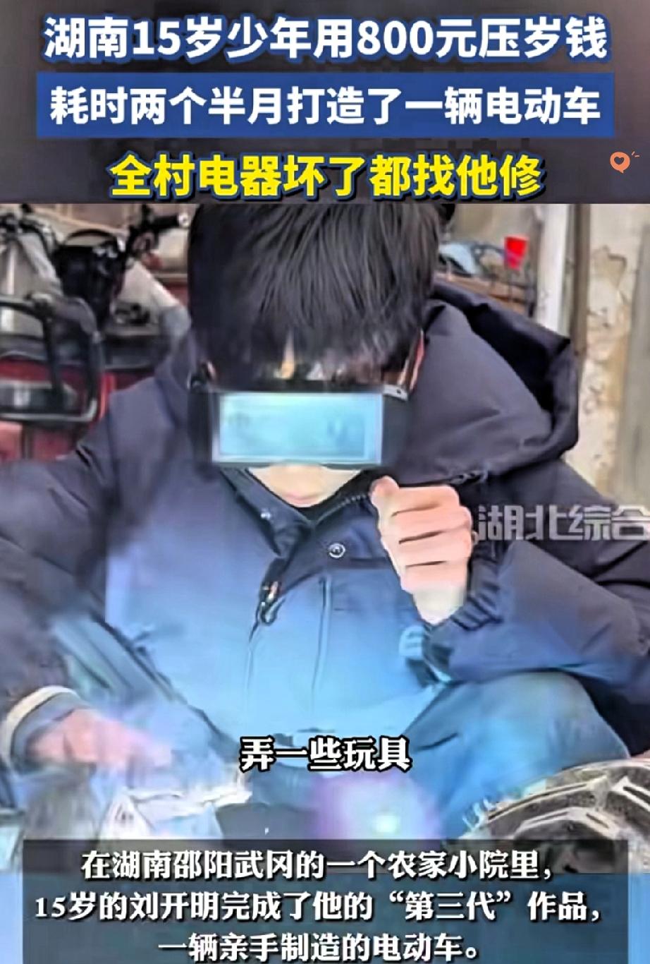 15岁少年800元压岁钱造电动车,这才是真·少年强! 湖南邵阳15岁初三生刘开明,硬是靠800元压岁钱,手工造出了一辆第三代电动车 。 没有专业设备和图纸,全靠网上自学,两个半月筹备、一天半组装,钢管车架、二手电机,踩油门就能跑,理论续航50-60公里,山路上也能稳跑30公里。 别人攒压岁钱买玩具、充游戏,他却把热爱焊成了能跑的车 。 更难得的是,他从小和奶奶相依为命,偷偷造车怕奶奶心疼,还不忘给家里装智能控制器、帮乡邻修电器,妥妥的孝心少年。 这才是青少年该有的榜样! 比起沉迷手机,这种敢想敢干、把知识变实践的劲头,才是最珍贵的财富。 少年的热爱和坚持,比任何玩具都有价值。 你觉得这样的硬核少年有多酷? 如果是你,会用压岁钱做这么有意义的事吗?