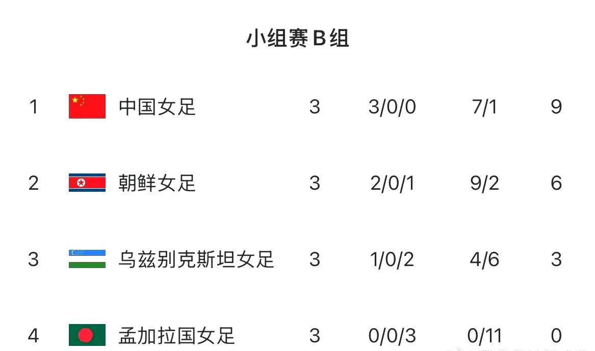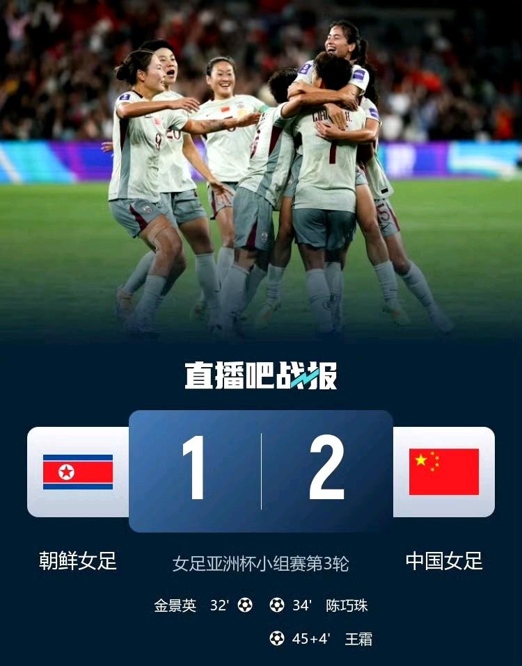 出乎意料的惊喜!咱们不但胜了,而且是逆转击败强大的对手! 朝鲜队在比赛第32分钟率先破门,随后中国女足迅速回应,陈巧珠在第34分钟以一记远射“贴地斩”扳平比分,上半场补时阶段,王霜攻入反超进球,最终中国队2-1获胜。 中国队豪取三连胜锁定B组头名晋级八强,1/4决赛对阵C组第二,不用打澳大利亚了。