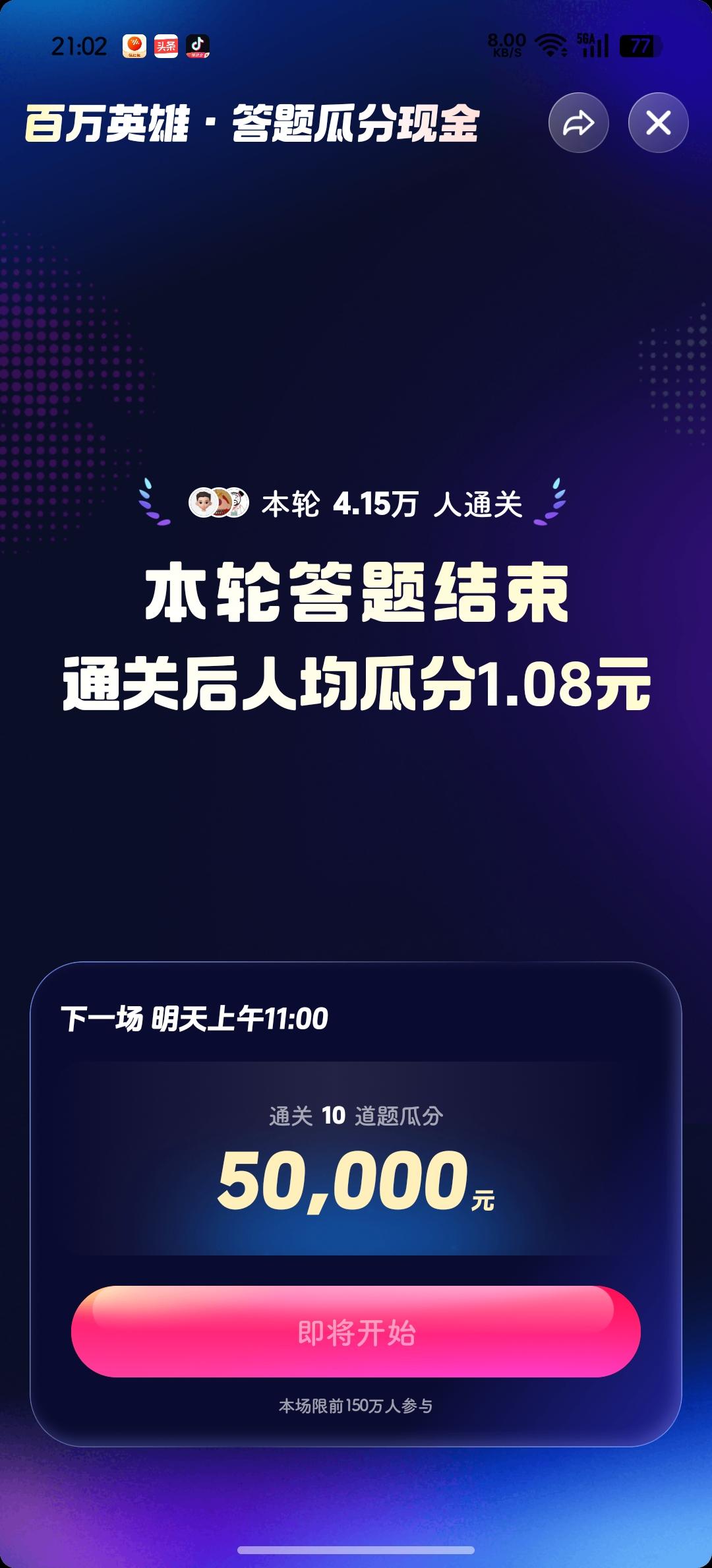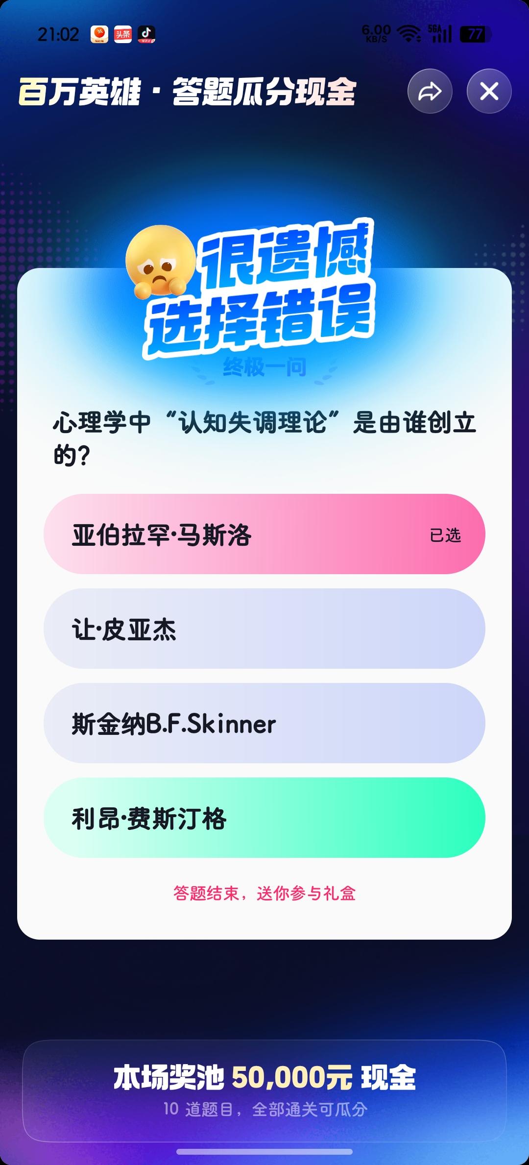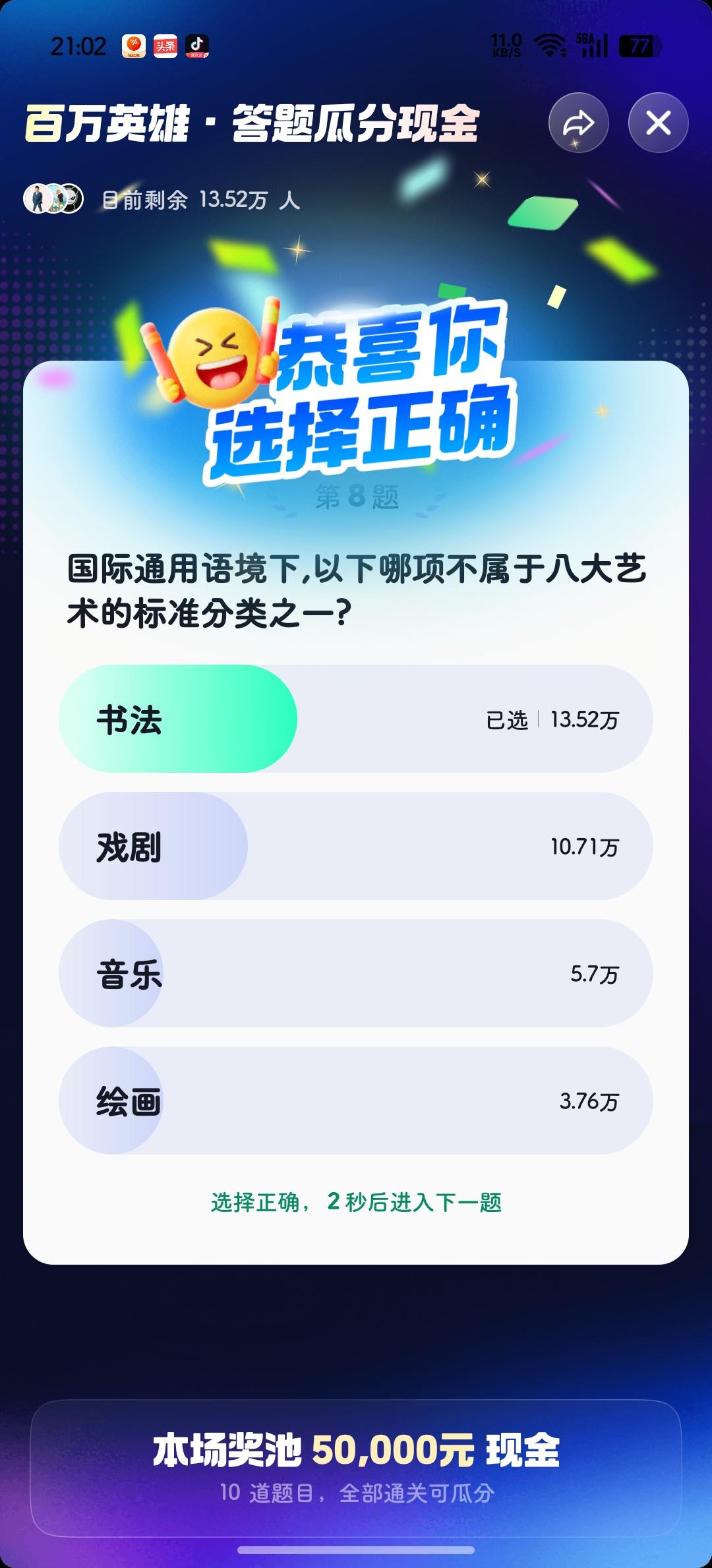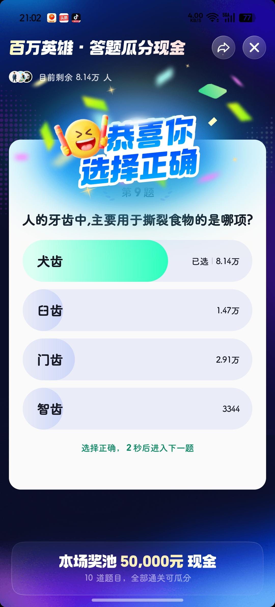 今晚答题错在最后一题,还不如错在第一题,可惜了啊![捂脸] 第八道题(图2️⃣)刷掉了十几万人,我倒是答对了! 明天继续~[加油]