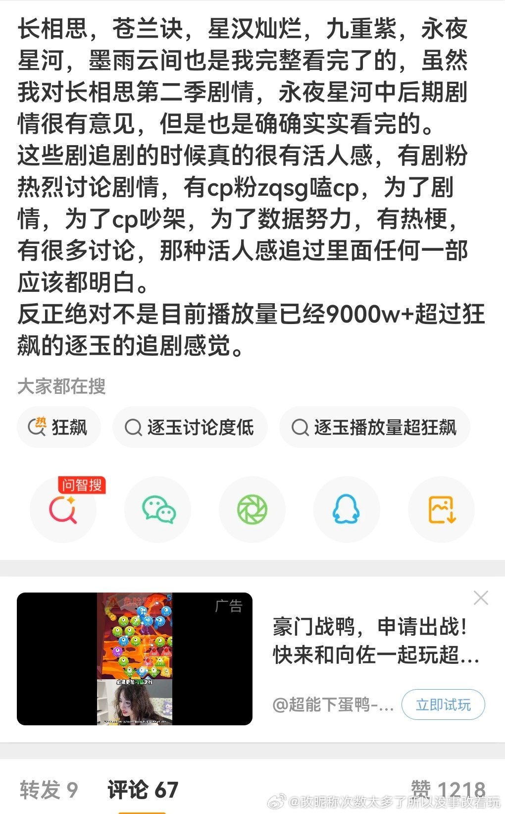 虽然逐玉确实没剧情讨论度但是就自己举得这些例都根本既不是一个播放量也不是一个讨论度量级的谁会觉得7000+、6000、4000擦边儿魔芋播完王星越仍是半素人、相思苍兰爆当时大流量级艺人都是一个量级啊