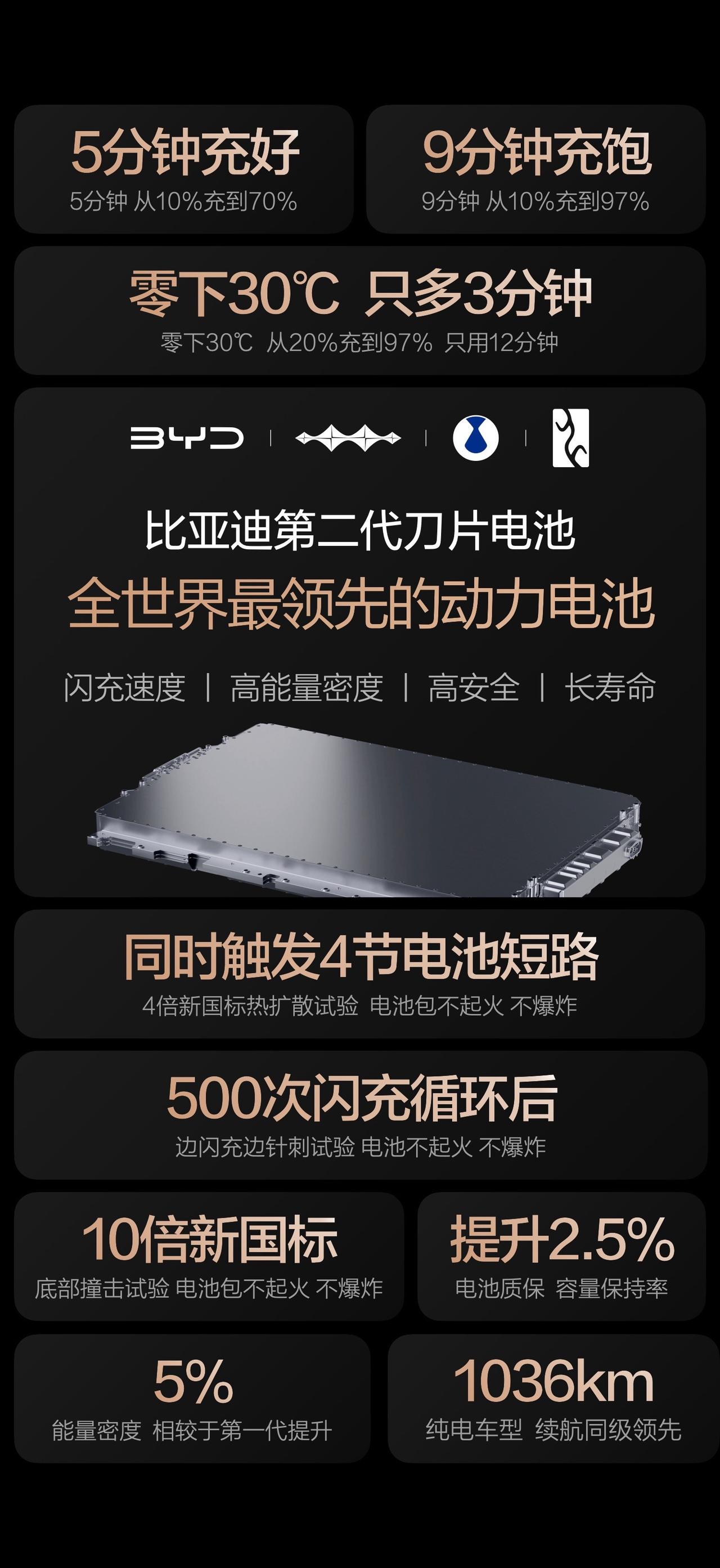 刚刷了一圈,果然,“闪充伤电池”的质疑虽迟但到。 特逗,每次咱们的技术一有点突破,总有人急着跳出来当“懂王”。 3月5日,比亚迪第二代刀片电池发布了——5分钟充好、9分钟充饱,零下30度只多3分钟。硬核闪充技术树立行业新标杆!数据太硬了,硬到某些人不知道怎么黑了,于是翻来覆去还是那句老话术:“充这么快,不伤电池吗?” 讲真,这种焦虑十年前我信,现在嘛……只想说一句:“懂王”们低估了比亚迪的技术实力! 以前快充伤电池,是因为那是“普通电池硬上大功率”,属于赶着马儿跑还不给马儿吃草。但现在比亚迪第二代刀片电池是从底层把“马路”拓宽成“双向八车道”,搞了个“锂离子高速通道”。再加上“全温域智能热管理系统”,少产热,快散热,让闪充对电池寿命几乎没有影响,既充得快,又很耐用。 电池是电动汽车最贵的部件,如果闪充真会把电池搞废,第一个急得跳脚的不应该是车企自己吗?毕竟质保期内坏了得他们真金白银掏钱换! 比亚迪这次不仅没怂,反而加大了质保力度:“容量保持率”整体提升2.5%,电池容量低于77.5%就免费包换,电芯依旧是“终身保修”。这不比那些“懂王”实在多了? 看实测:500次闪充循环后(相当于跑了30万公里),一边闪充一边针刺,结果不起火、不爆炸。热扩散试验更是直接“加戏”,新国标让1节电池热失控,它非要挑战4节短路。这么个测法,要是真没两把刷子,那不是给自己挖坑吗? 总之一句话——能把“承诺”直接写进质保里的技术,比网上敲键盘的声音,靠谱一万倍!